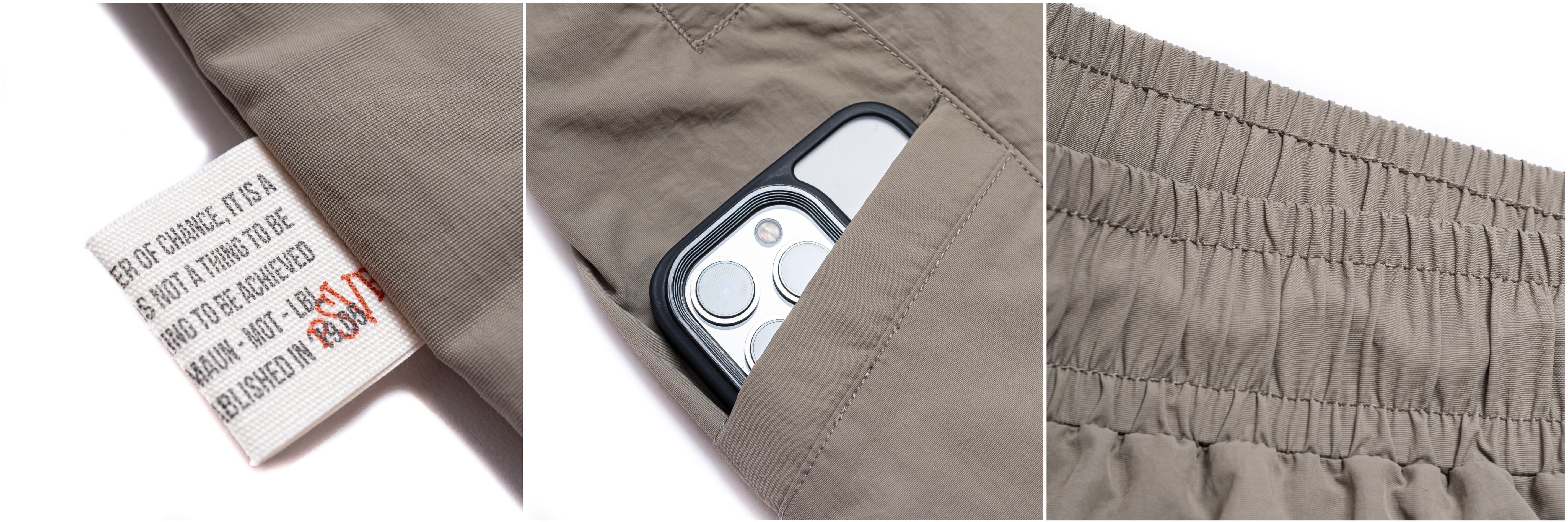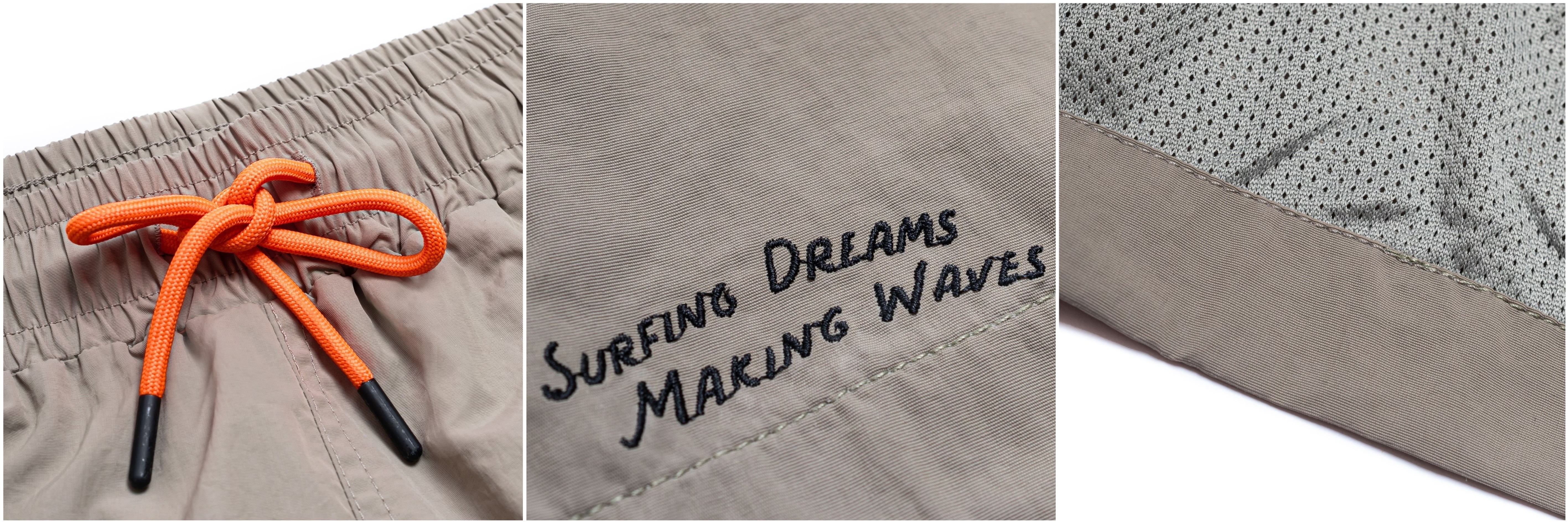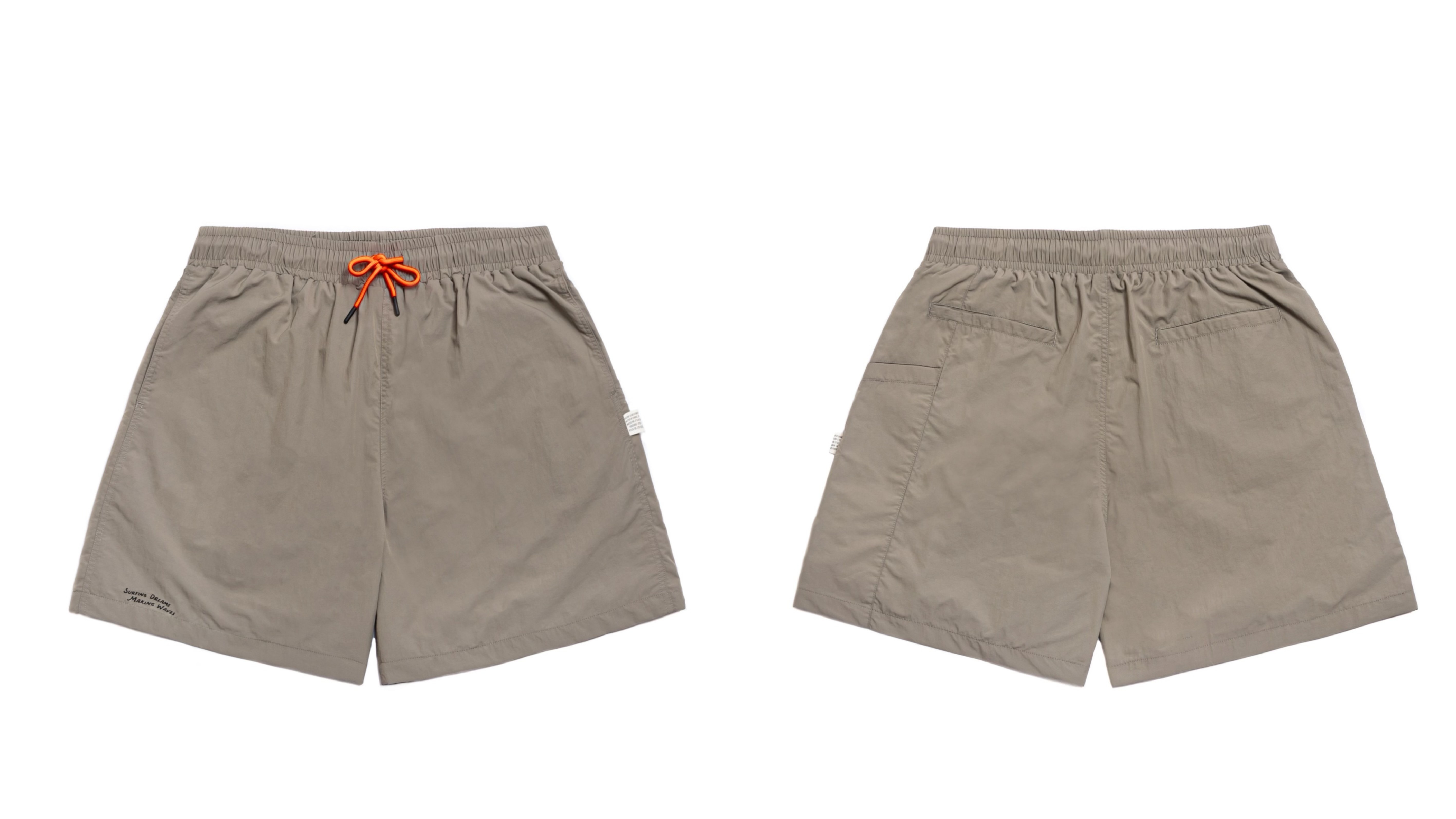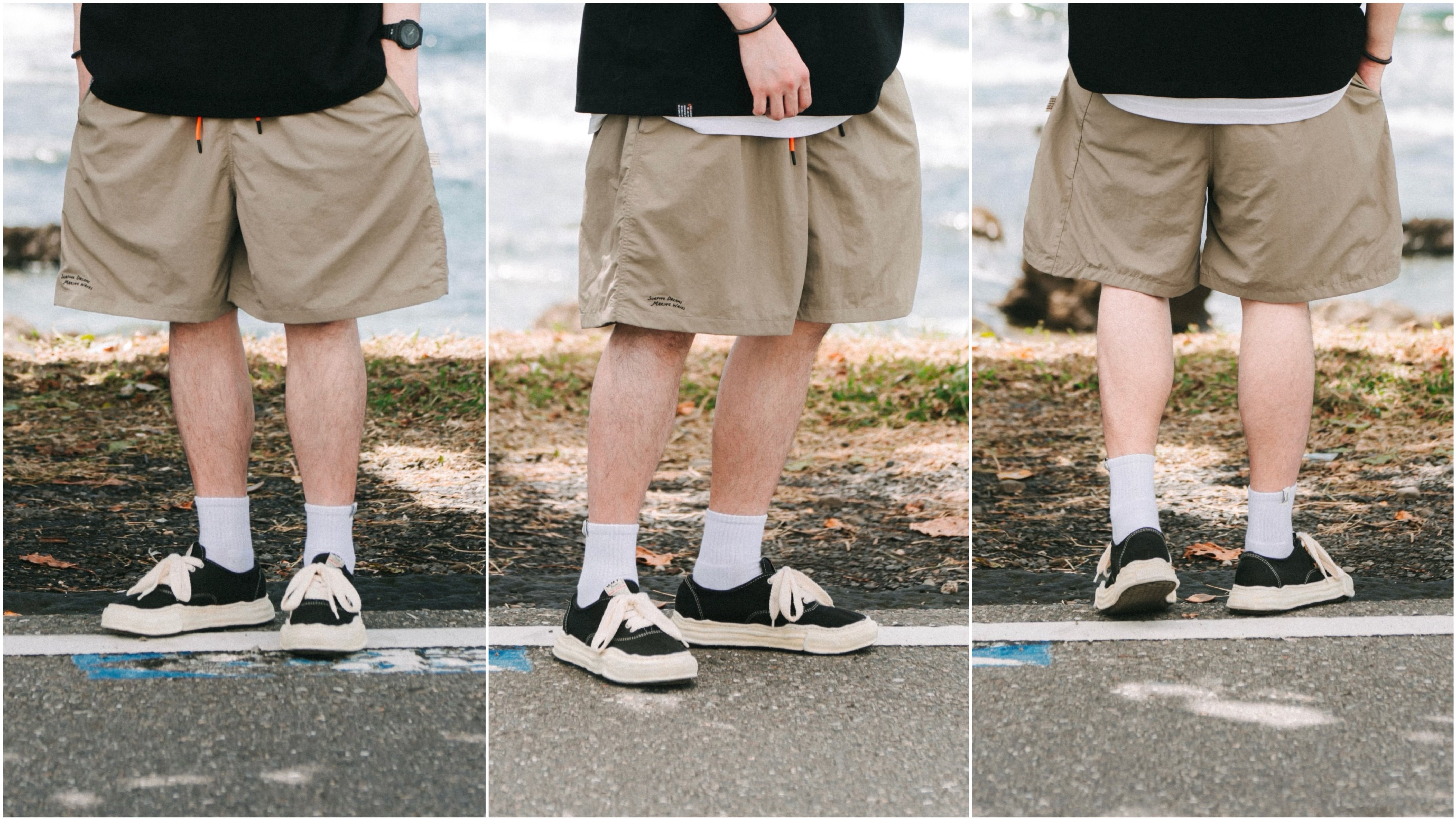 夏季別注系列第七款,以夏季海灘休閒為概念,選擇微抓皺防潑水尼龍面料製作,搭配柔軟透氣的網布內裡,提供著用時的舒適質感,細節方面,在褲管使用本季核心概念標語刺繡、側口袋下方的織標配置與顯目的撞色抽繩,褲型採用寬鬆俐落的版型呈現,背後增加拼接口袋設計,適合與各式上衣搭配,輕鬆穿出度假休閒氛圍。
