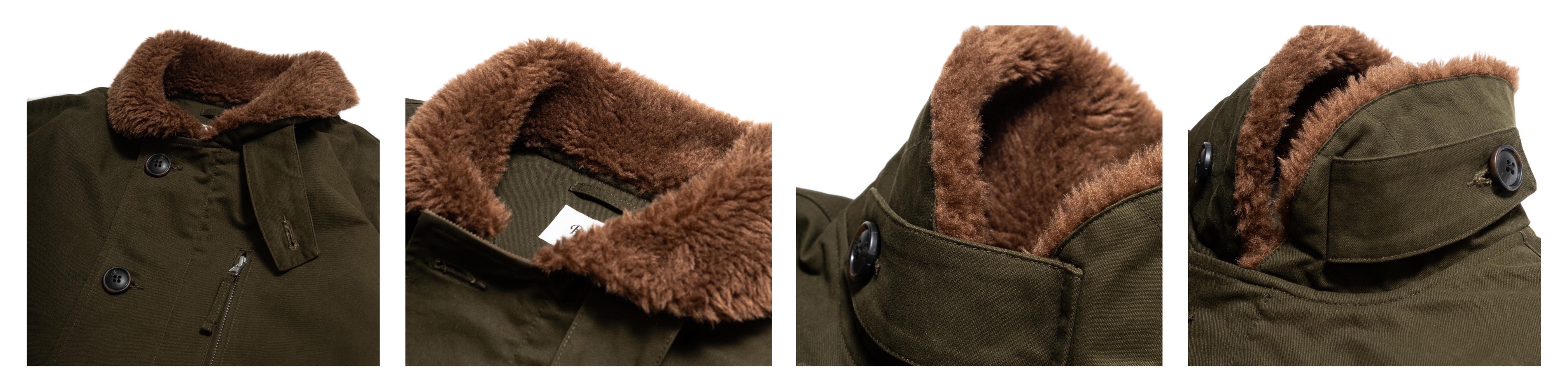 ● 選用毛絨材質製作外套衣領,增加可收納式防風領片設計,搭配袖口內厚螺紋細節,大幅提升整體禦寒度。