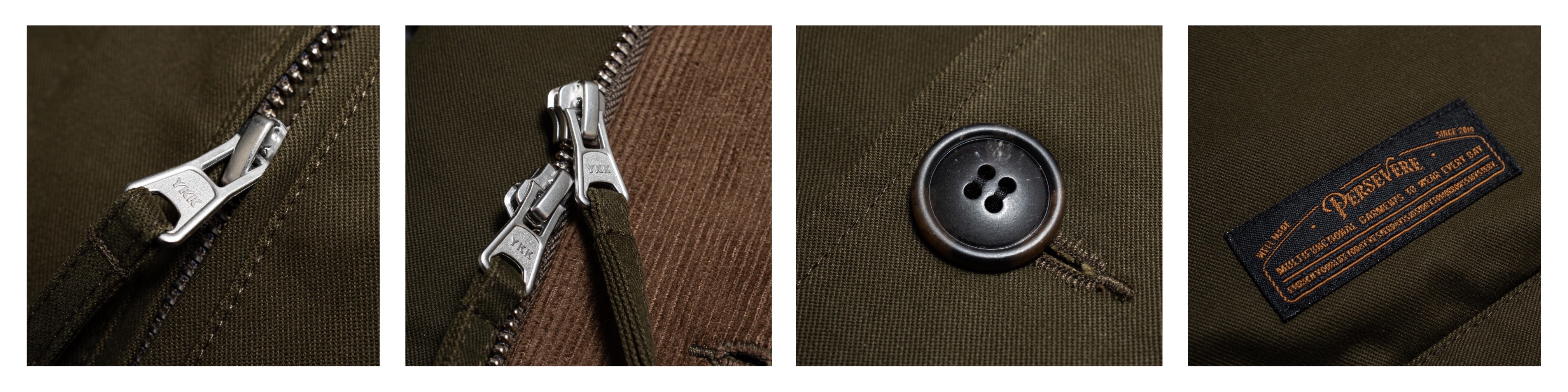 ● 精挑深琥珀鈕釦作為主釦使用,配合門襟檔風片內側的咖啡燈心絨設置,提高細節質感。