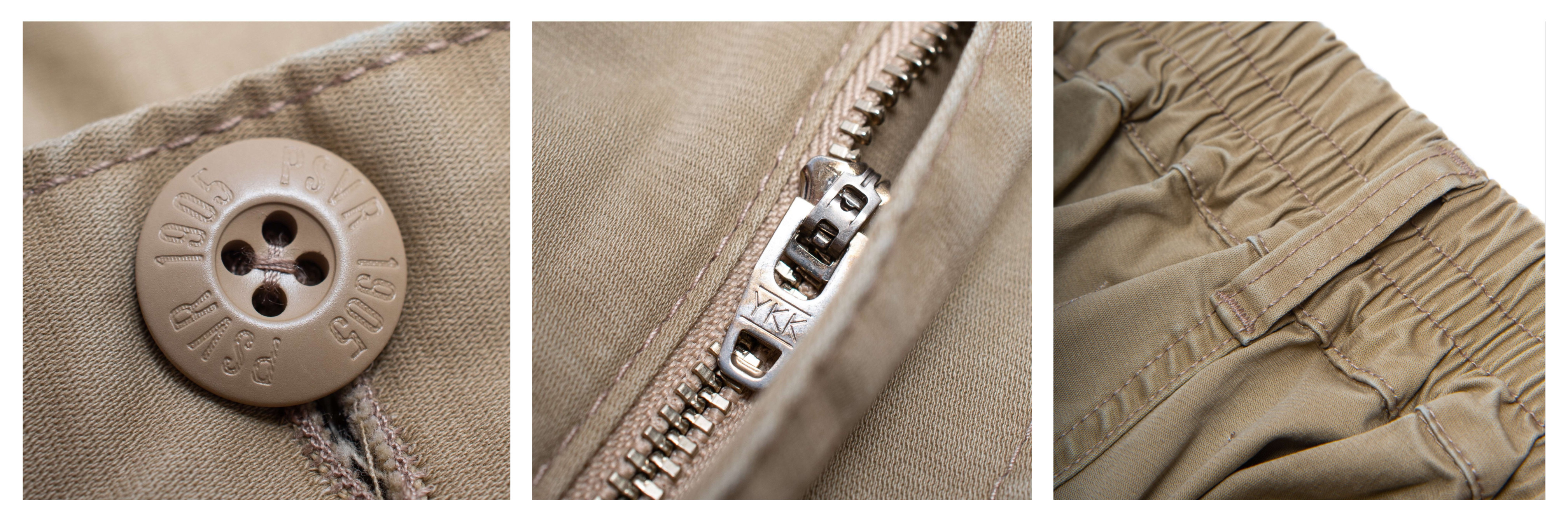 ● 後腰圍鬆緊帶設定、YKK 拉鍊五金使用、品牌尿素釦、褲管小插袋搭配品牌米白織標..等等細節,增加穿著的使用質感。