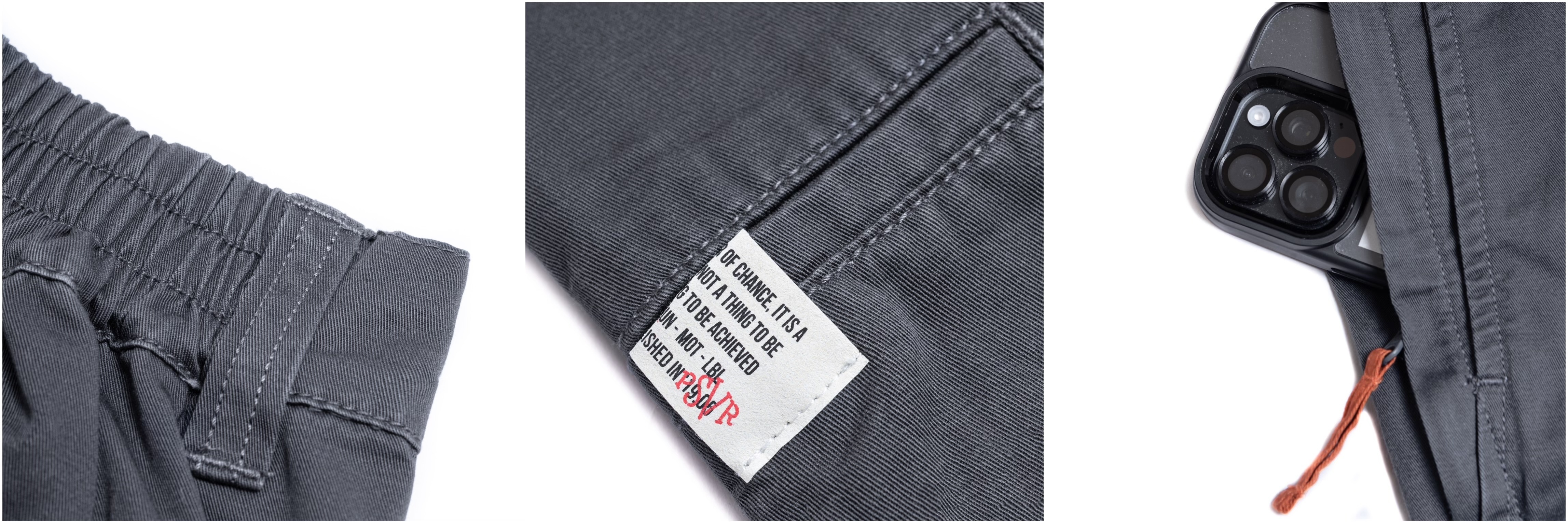 ● 褲側雙手插袋設定,拉鍊袋使用撞色拉繩、搭配褲耳D字環,增加穿著使用的機能性。