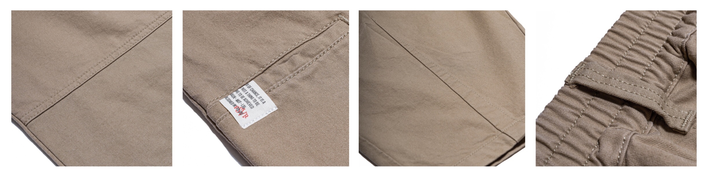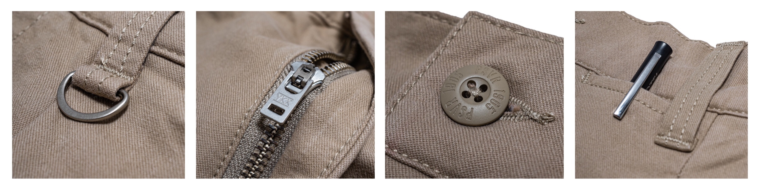 ● 左後方褲管的小插袋設定、PERSEVERE 新版米白織標、褲耳D字環、人字紋面料裡布..等等細節,增添穿著時的使用質感。