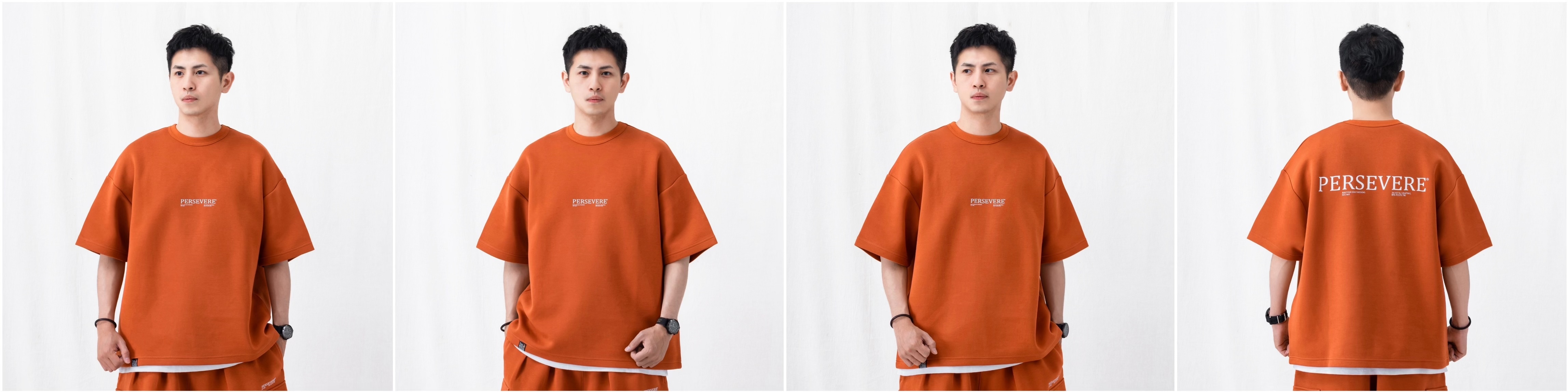 PERSEVERE 春夏棉套裝 – 寬版棉質T恤全新發售,採用厚磅棉質混紡空氣層布料製作,帶來舒適且扎實的手感,搭配全新品牌字樣設計,並以立體印刷工序呈現,十分適合作為日常著用。版型以寬短輪廓為設定,營造俐落且具份量的著用感,同時經二次預縮處理,進一步延長衣物的著用壽命。