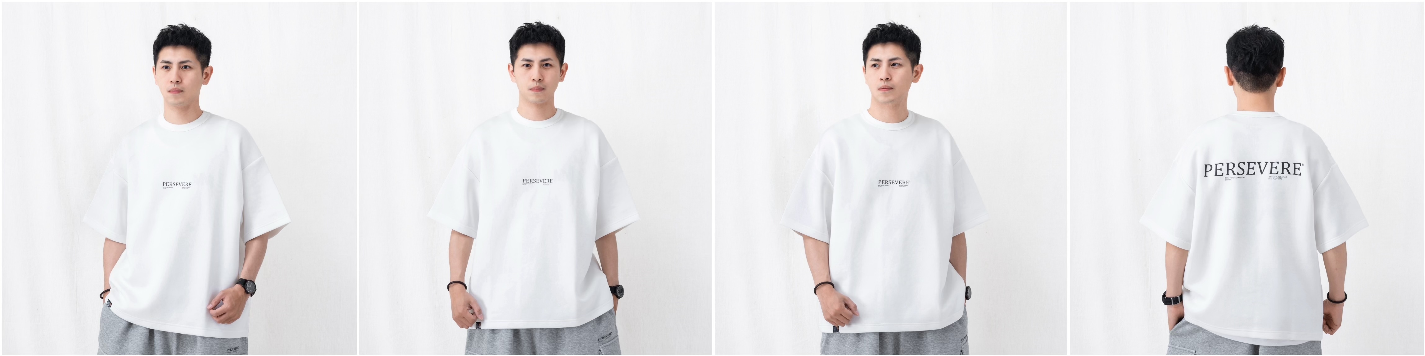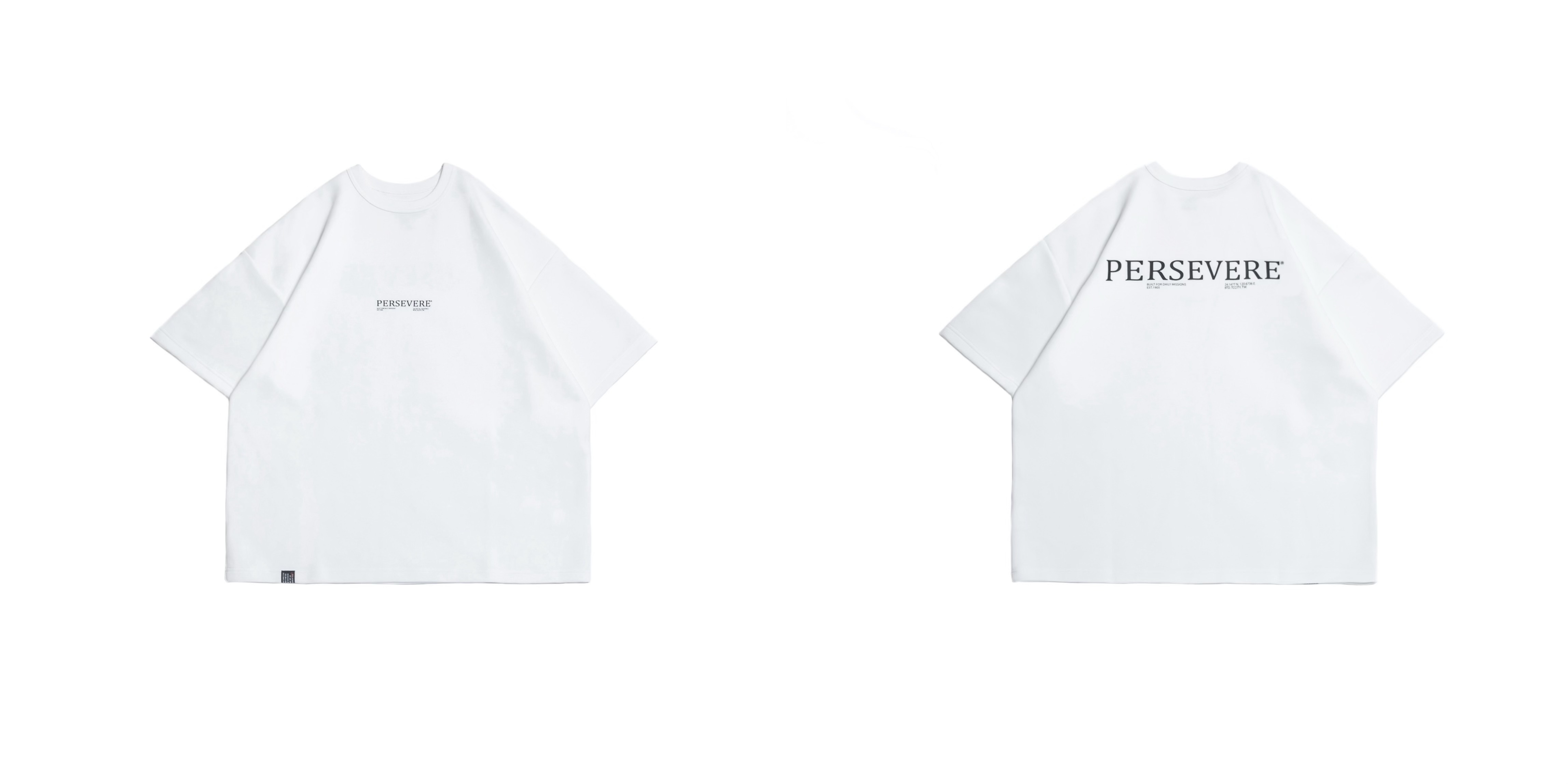 PERSEVERE 春夏棉套裝 – 寬版棉質T恤全新發售,採用厚磅棉質混紡空氣層布料製作,帶來舒適且扎實的手感,搭配全新品牌字樣設計,並以立體印刷工序呈現,十分適合作為日常著用。版型以寬短輪廓為設定,營造俐落且具份量的著用感,同時經二次預縮處理,進一步延長衣物的著用壽命。