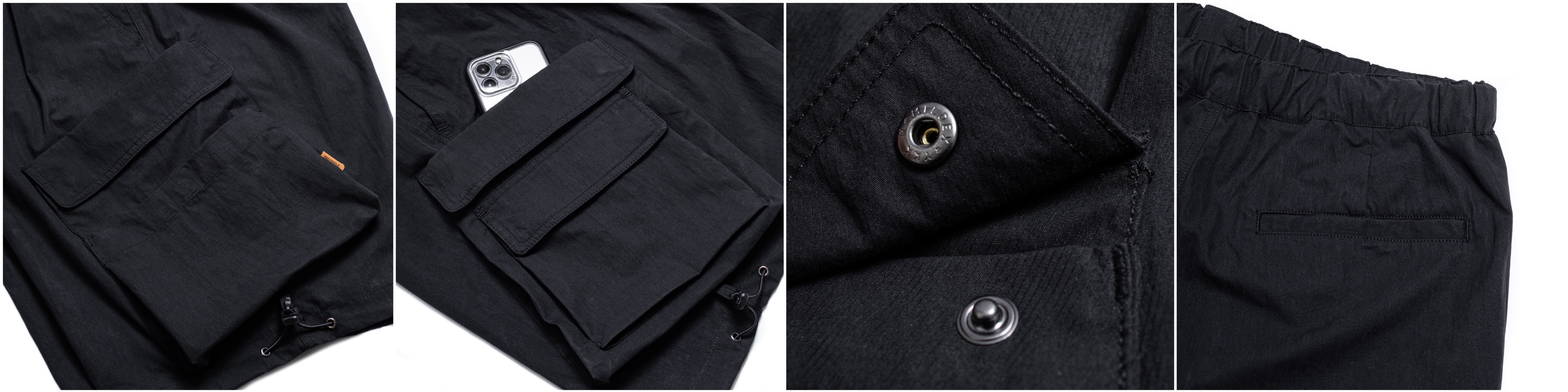 ● 兩側口袋下方增設抽繩扣具,提供褲管型態變化,增加不同的穿著造型感。