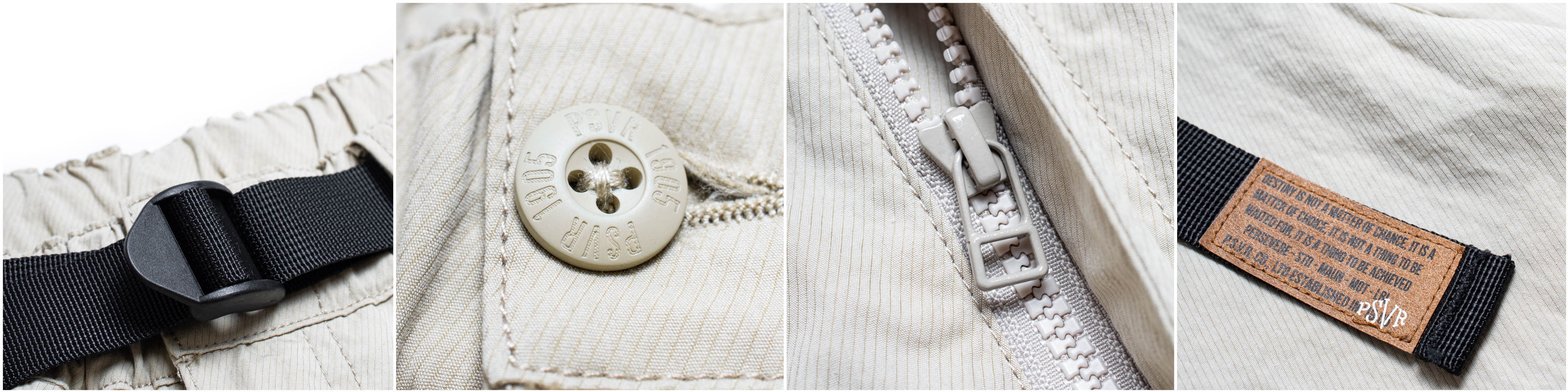 ● 加強穿著便利性與滿足各尺寸需求,採用褲頭鈕釦與可調節式腰帶,並搭配全腰圍鬆緊帶設定。
