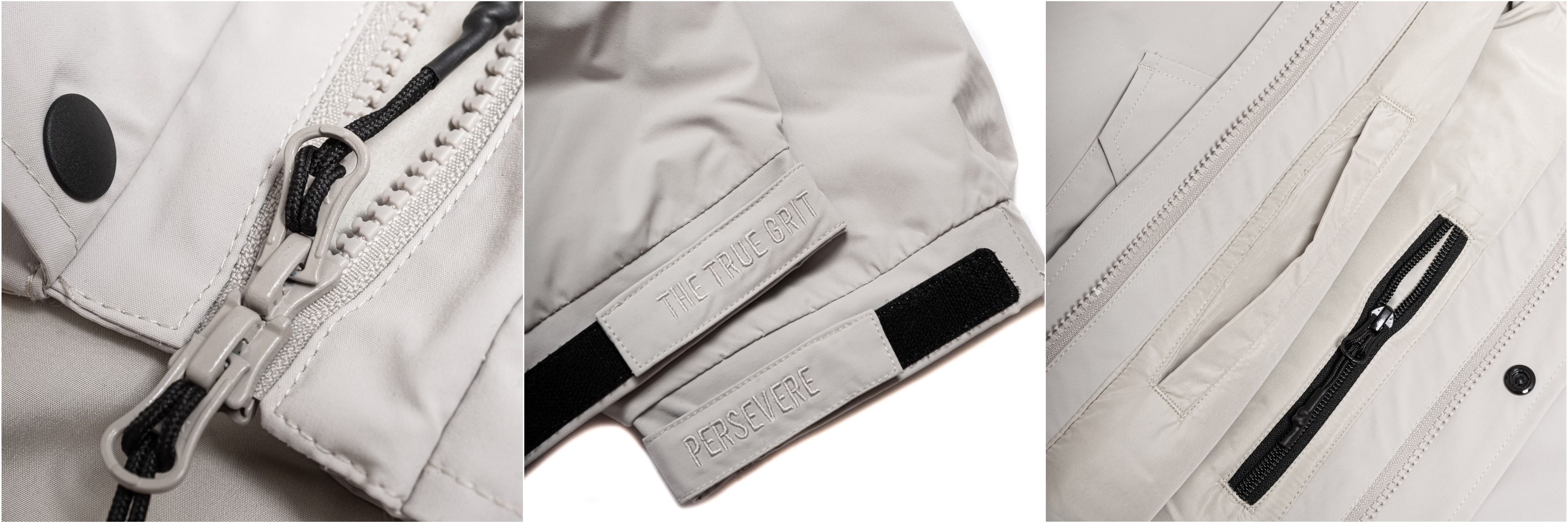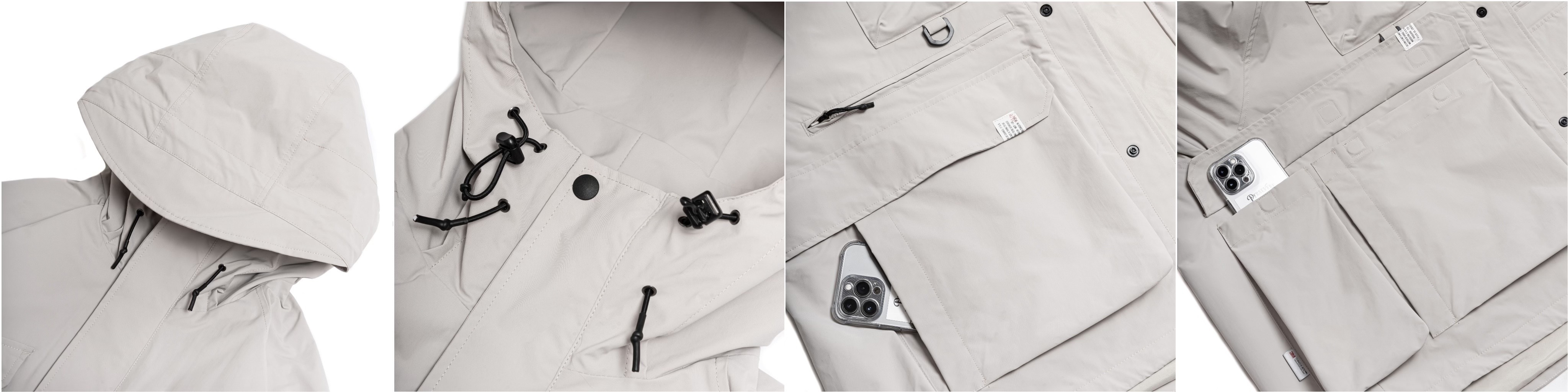 ● 連帽與下擺的調節扣具設定,兩層式擋風片門襟設計,搭配袖口高強度不粘毛魔鬼氈,大幅提升整體抗風強度。