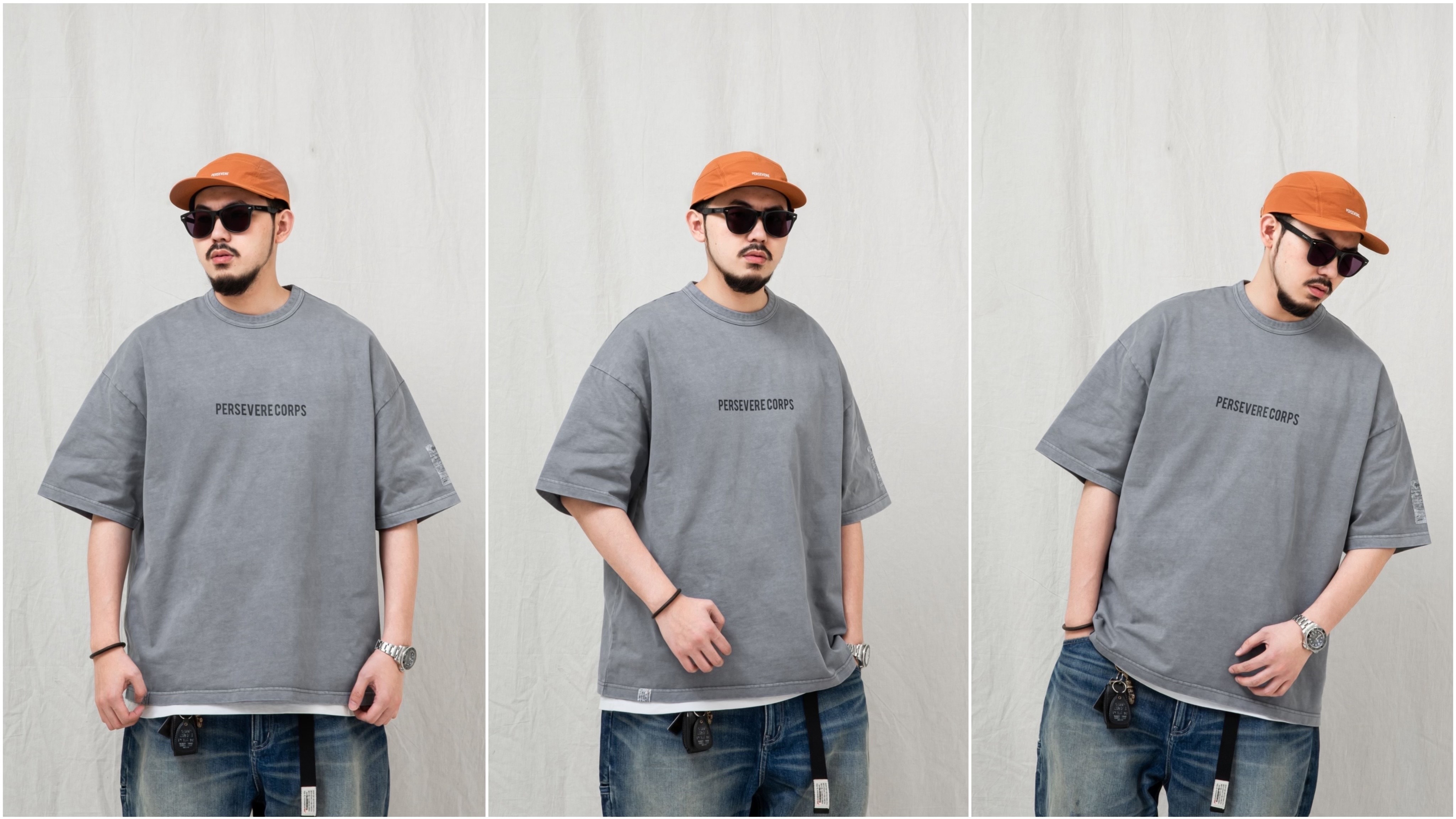 PERSEVERE 品牌標誌水洗T恤全新發售,採用舒適的高磅數雙股紗純棉材質製作,重設版型比例,維持寬鬆落肩輪廓,增加著用時的俐落感,並以 Pigment Dyeing 進行水洗工序,讓面料呈現自然的水洗紋路,搭配領口加厚羅紋包覆的外包式車縫固定細節,避免領圍變形並提升耐穿度,以延長衣物的穿著壽命。