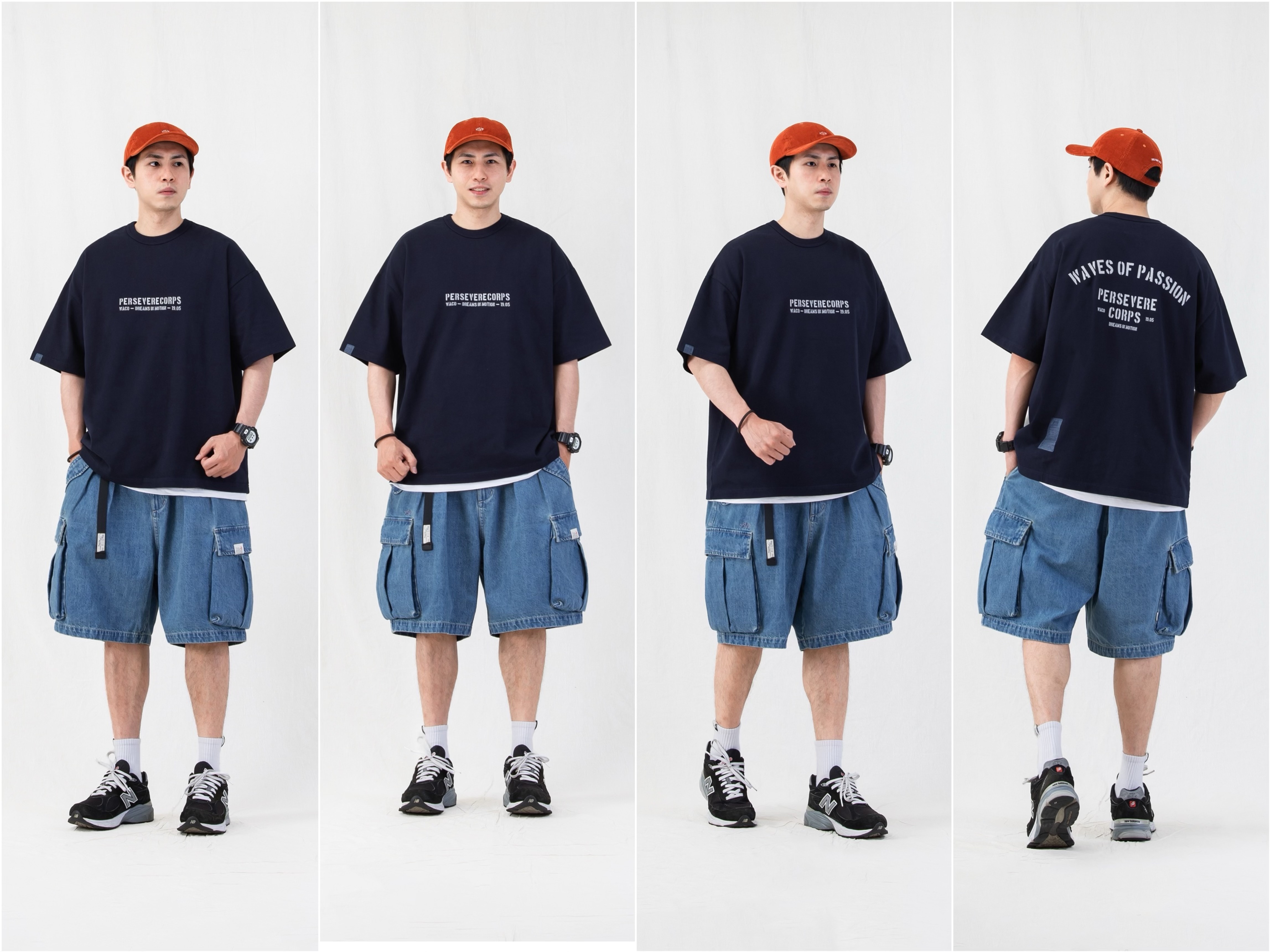 ● 寬鬆落肩版型設定,正背面皆印刷品牌標語圖樣,搭配同步染製水洗的品牌標、視覺織標細節,完成整體概念。