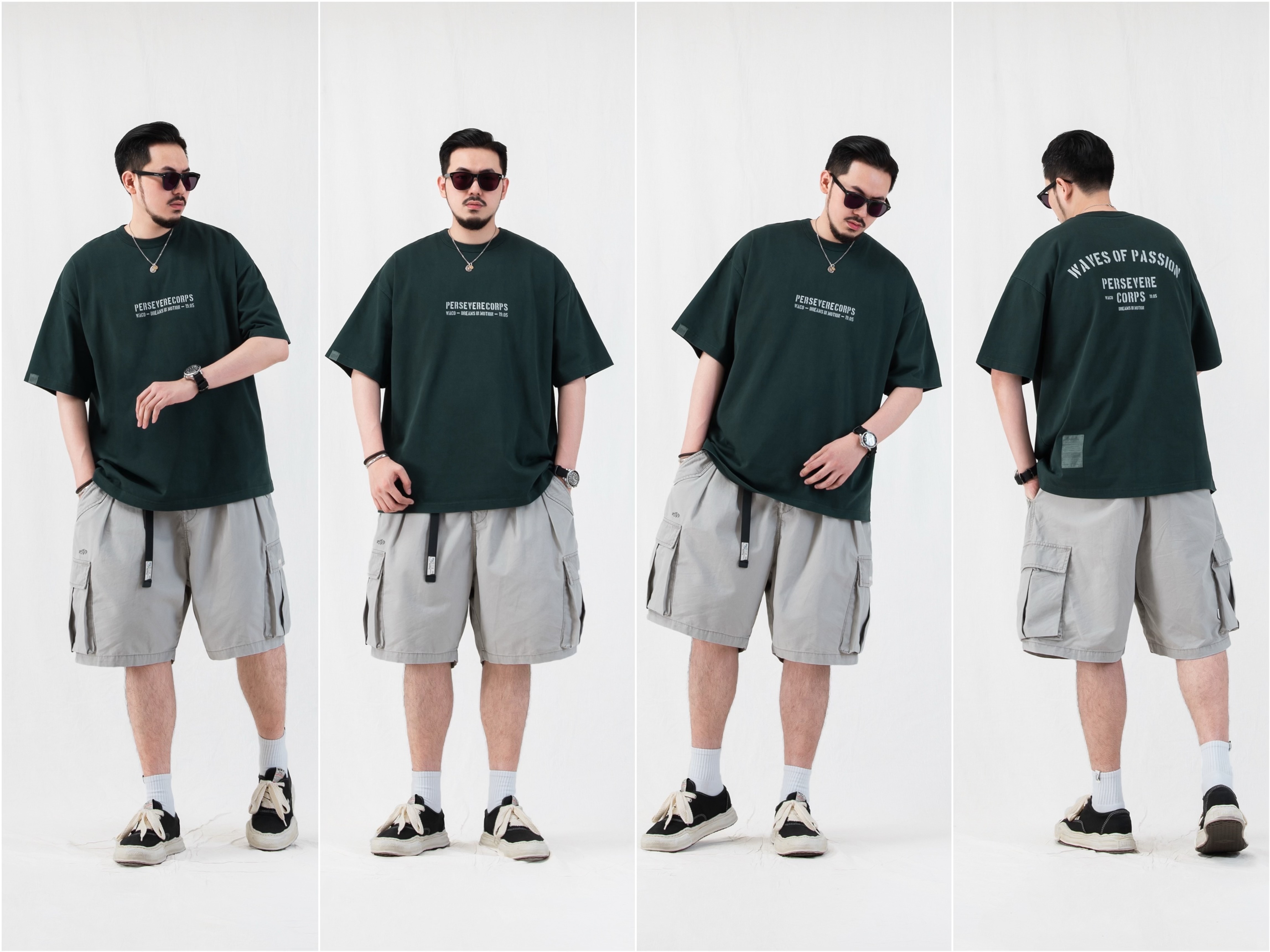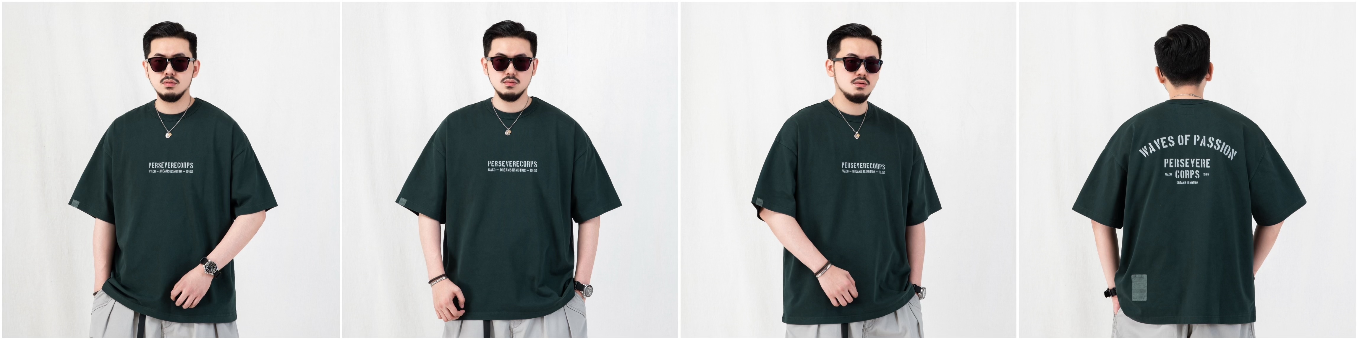 ● 寬鬆落肩版型設定,正背面皆印刷品牌標語圖樣,搭配同步染製水洗的品牌標、視覺織標細節,完成整體概念。