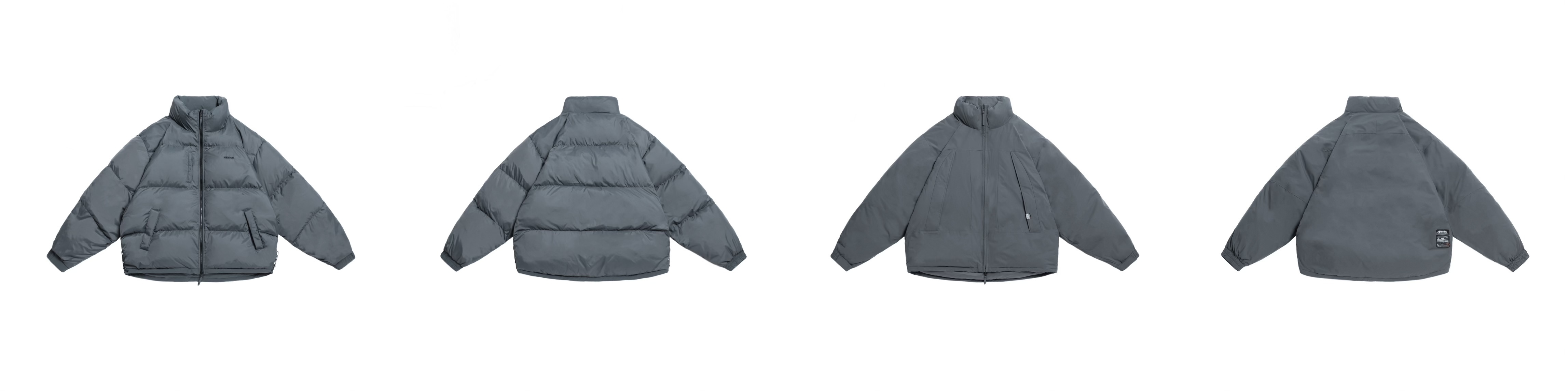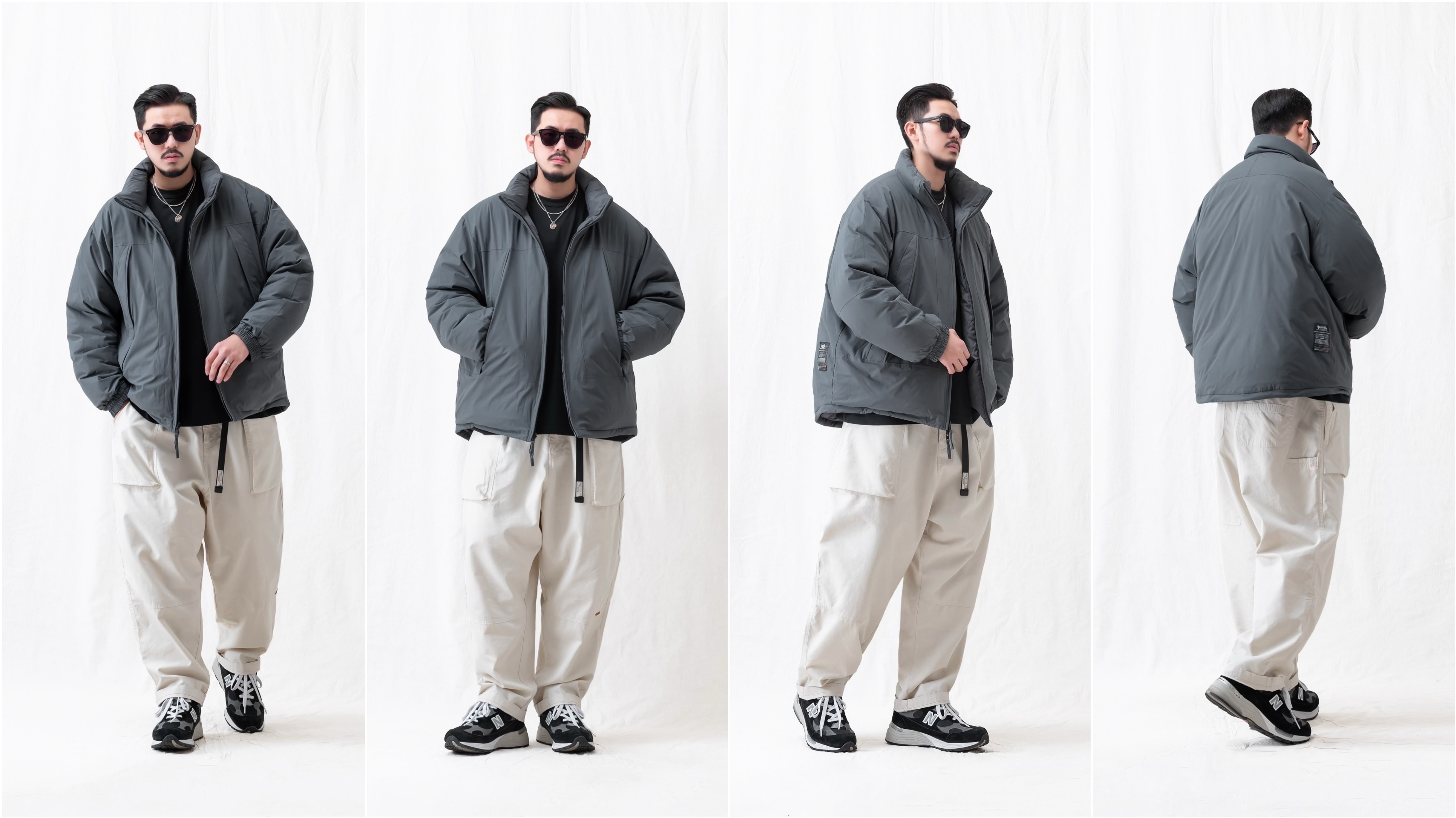 ● 參考 PCU Level 7 Type 1 Monster Parka 立領版型,重新調整為寬鬆落肩設定,搭配前短後長的版型輪廓,維持俐落的身形比例。