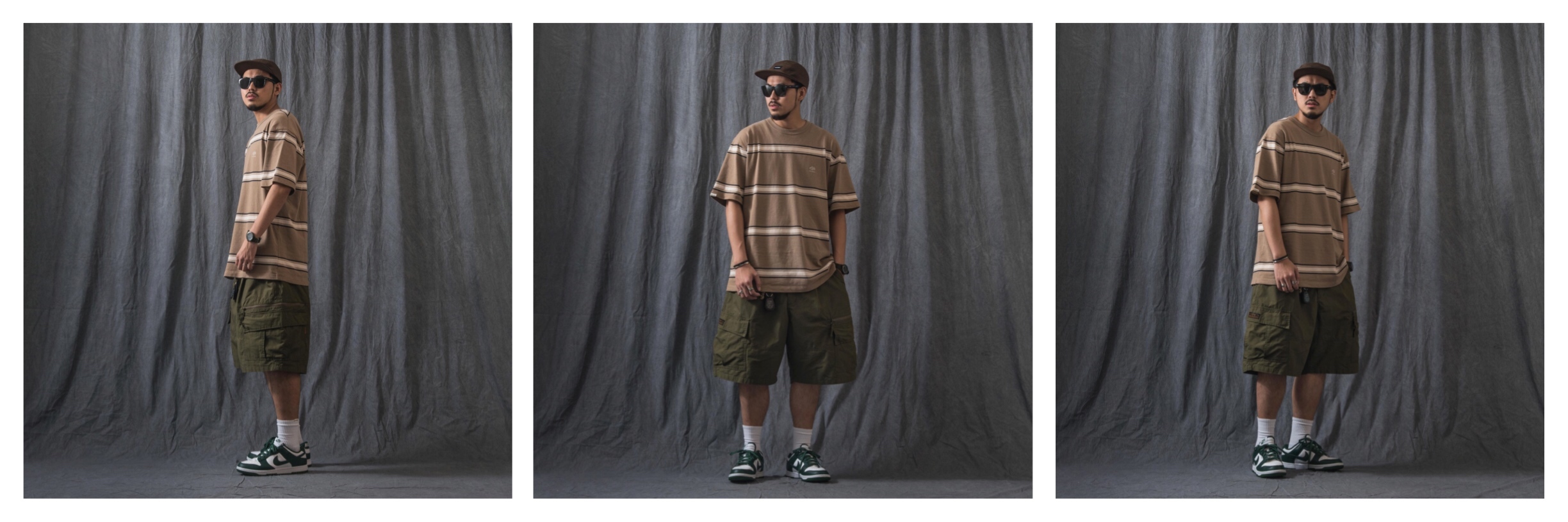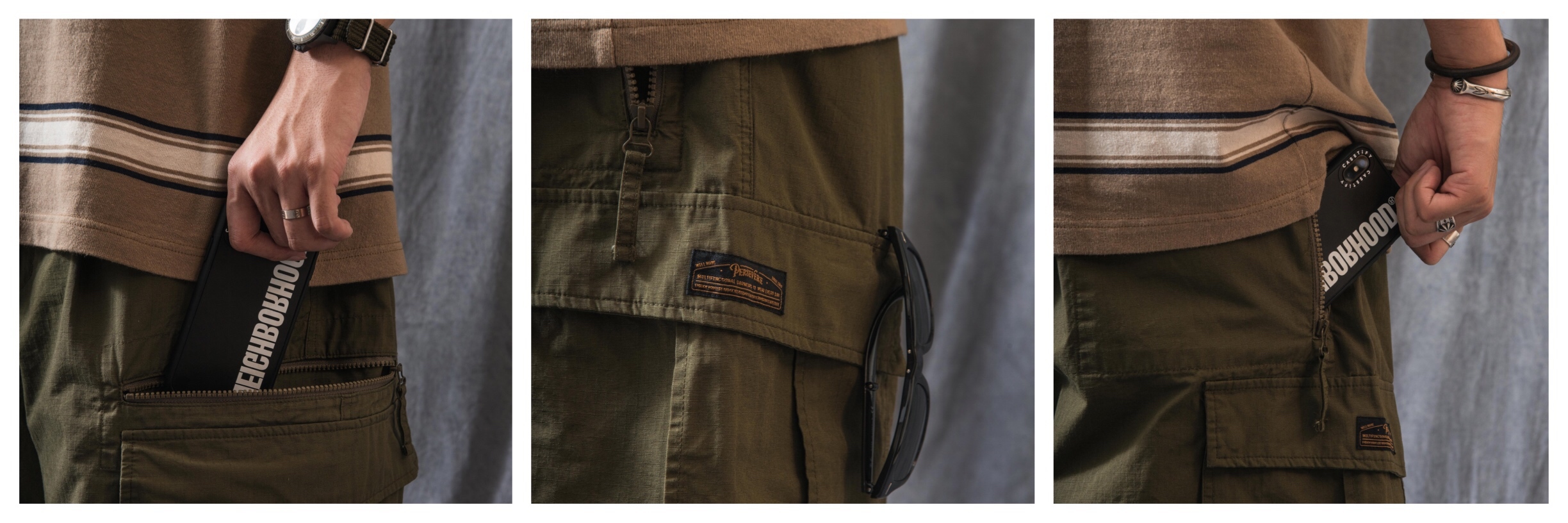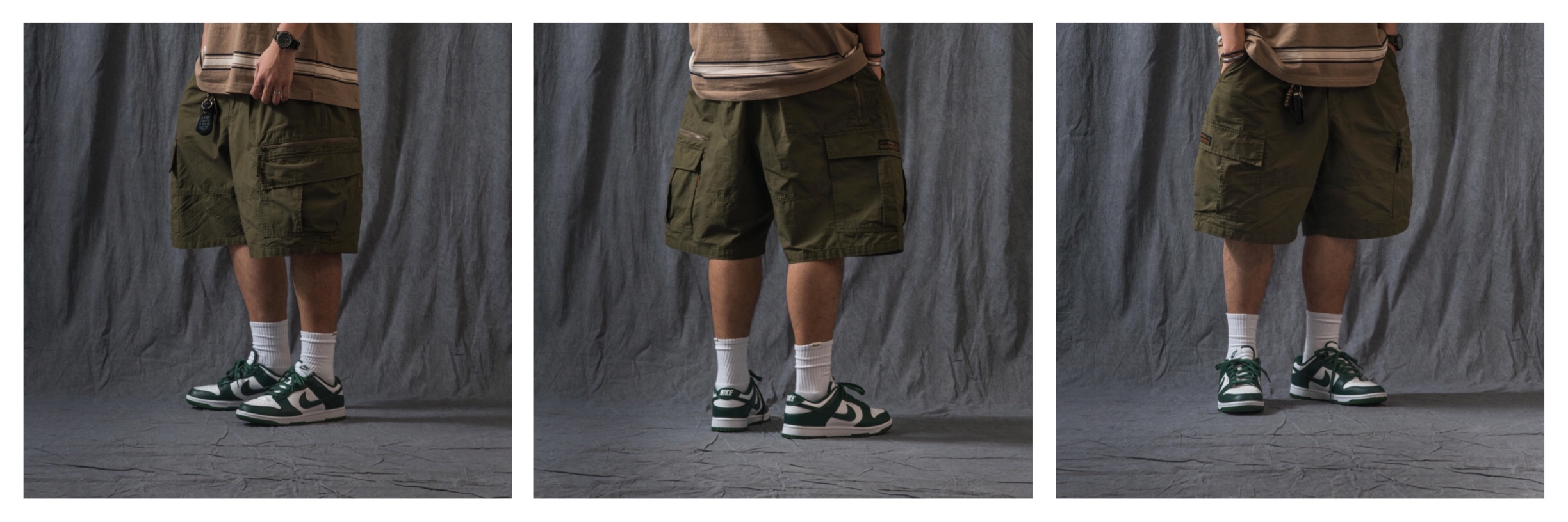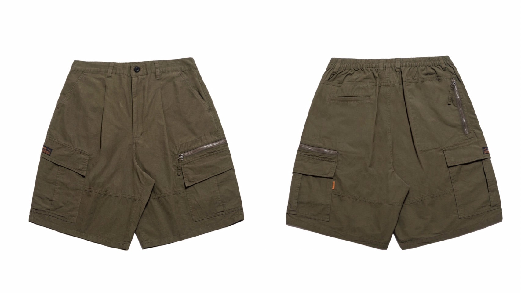 以功能實用作為新款 Cargo Shorts 設計主軸,特別選用軍裝常見的抗撕裂面料,具有透氣舒適、耐穿耐磨的特色,並將版型設定為寬鬆輪廓,透過腰圍下方的打摺線與褲管的剪裁細節,讓穿著時的褲型更加立體,搭配多個隱藏式、外顯式口袋設計,方便收納手機、鑰匙、皮夾、墨鏡、耳機...等等小物,讓實用功能性大幅提升。