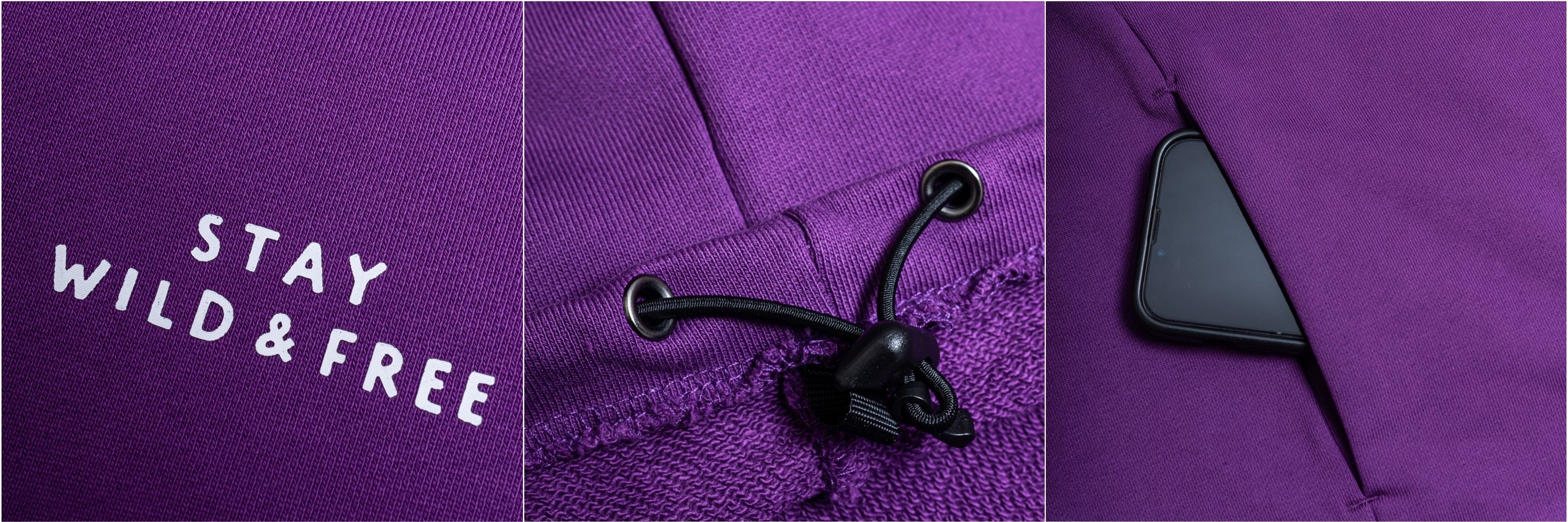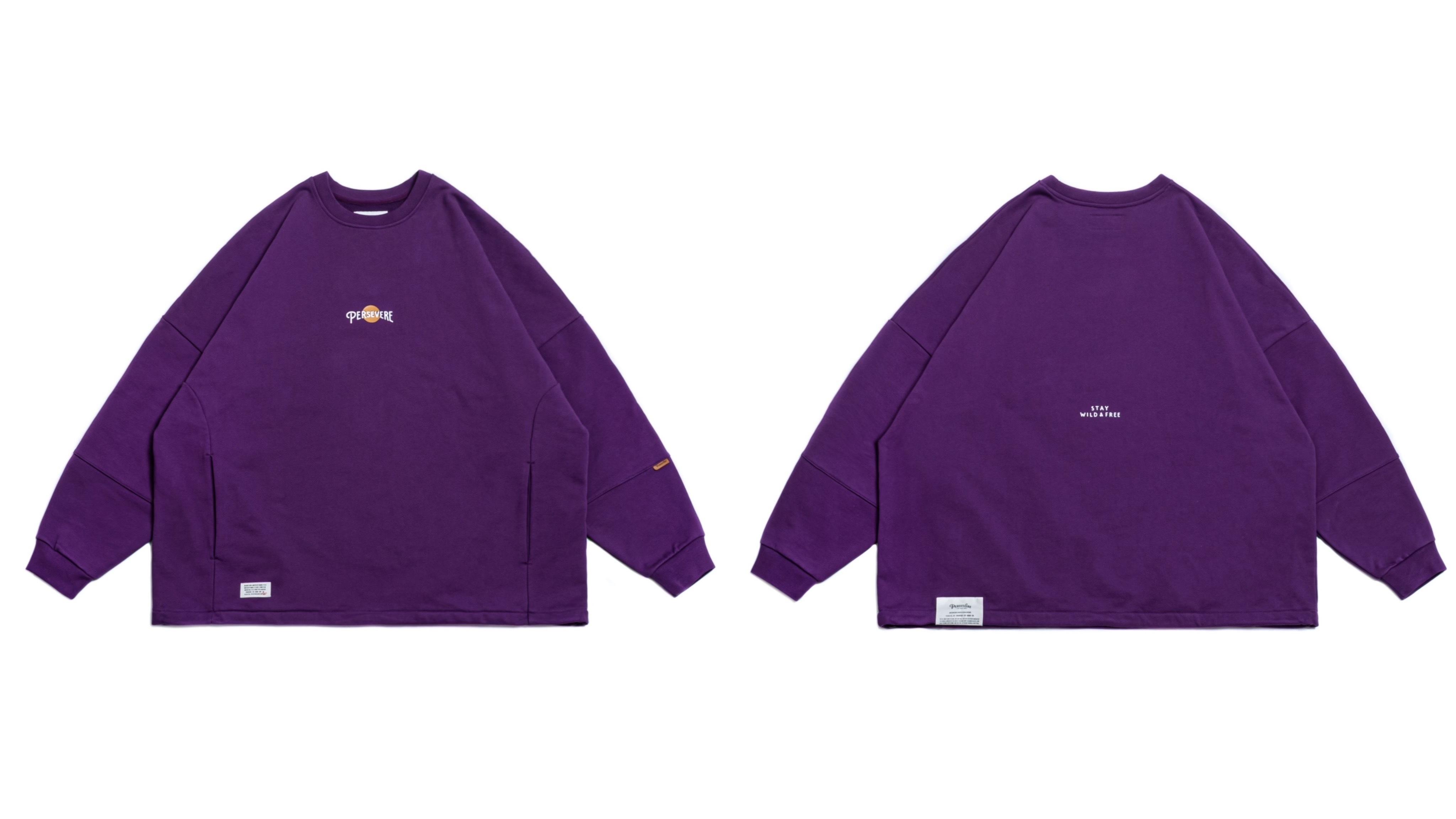 用來象徵堅持的核心理念,如旭日高掛持續發散正向能量,透過 STAY WILD& FREE 呼應整體概念;衣版部分,使用品牌經典特殊落肩版型,並挑選厚魚鱗棉布面料製作,搭配下襬內側抽繩扣具細節,滿足不同造型變化,是一款單穿外搭都相當合適的必備經典單品。