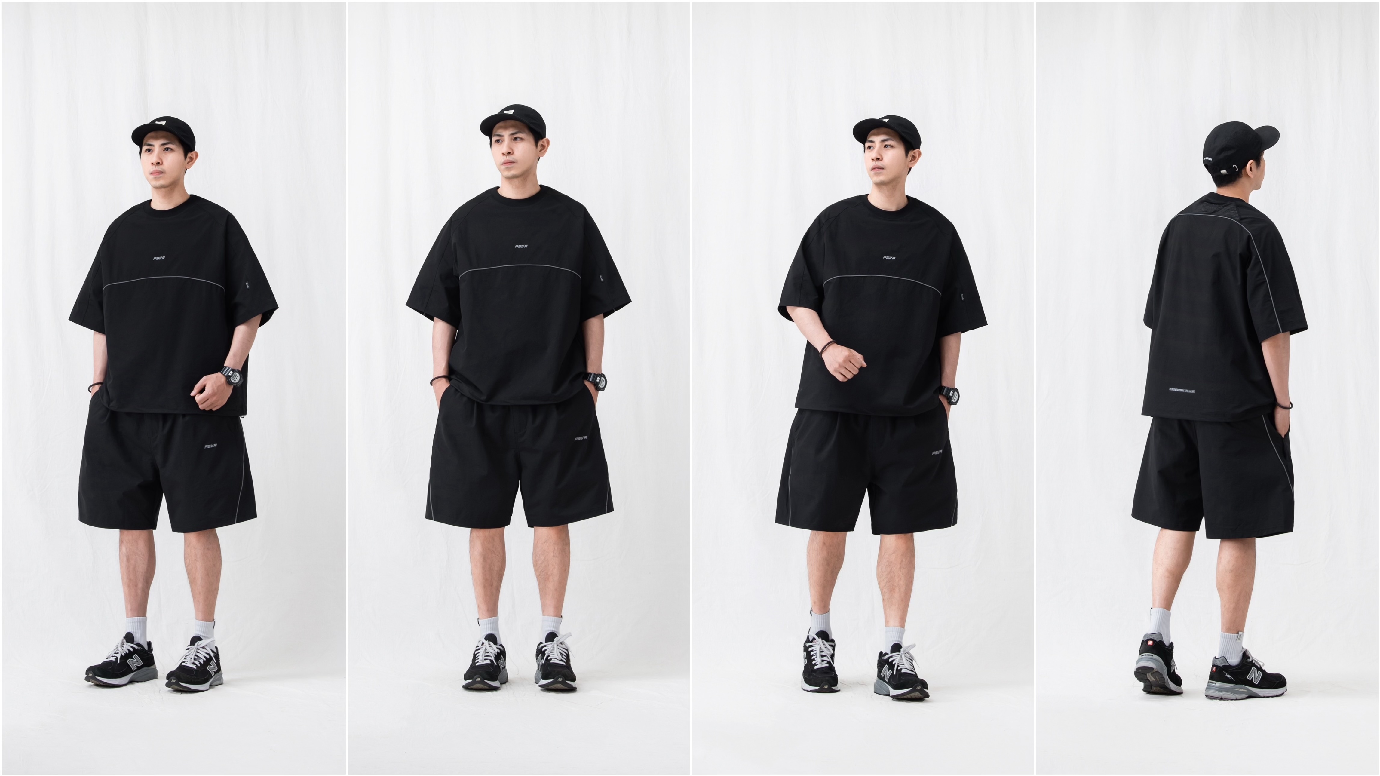 ● 以寬鬆搭配適中褲長的輪廓作為版型,以出芽飾邊設計為重點 ( 黑色搭配反光出芽 / 灰色搭配黑色出芽 ),褲型前後配置電繡與印刷設計,呈現品牌LOGO與文字標語圖樣。