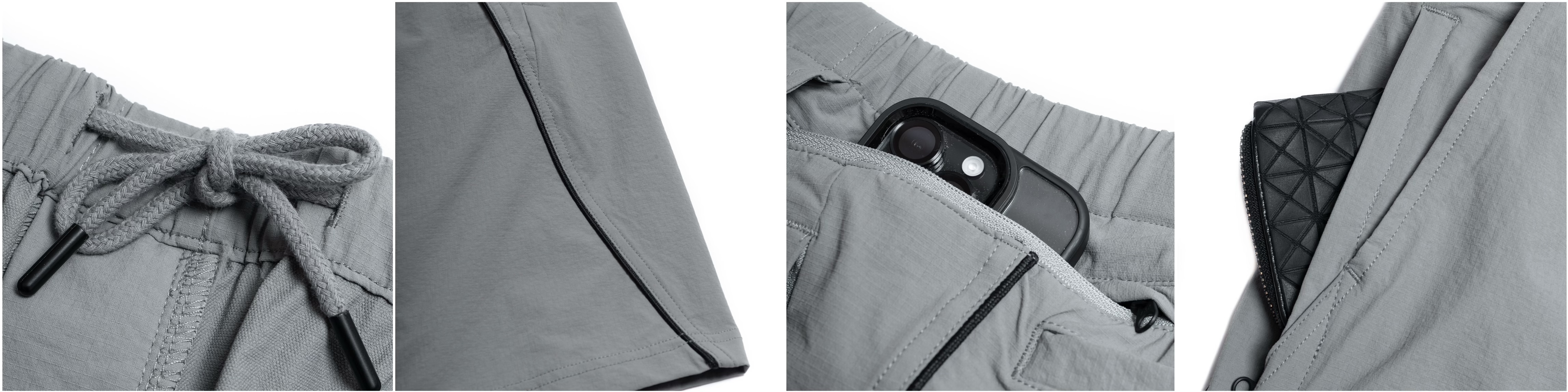 春夏機能戶外套裝 – 舒適彈性防潑水短褲全新發售,特選消光尼龍混紡彈性纖維布料進行製作,搭配剪接出芽飾邊設計,寬鬆的版型輪廓,配置八個收納口袋,強大著用的收納便利性。