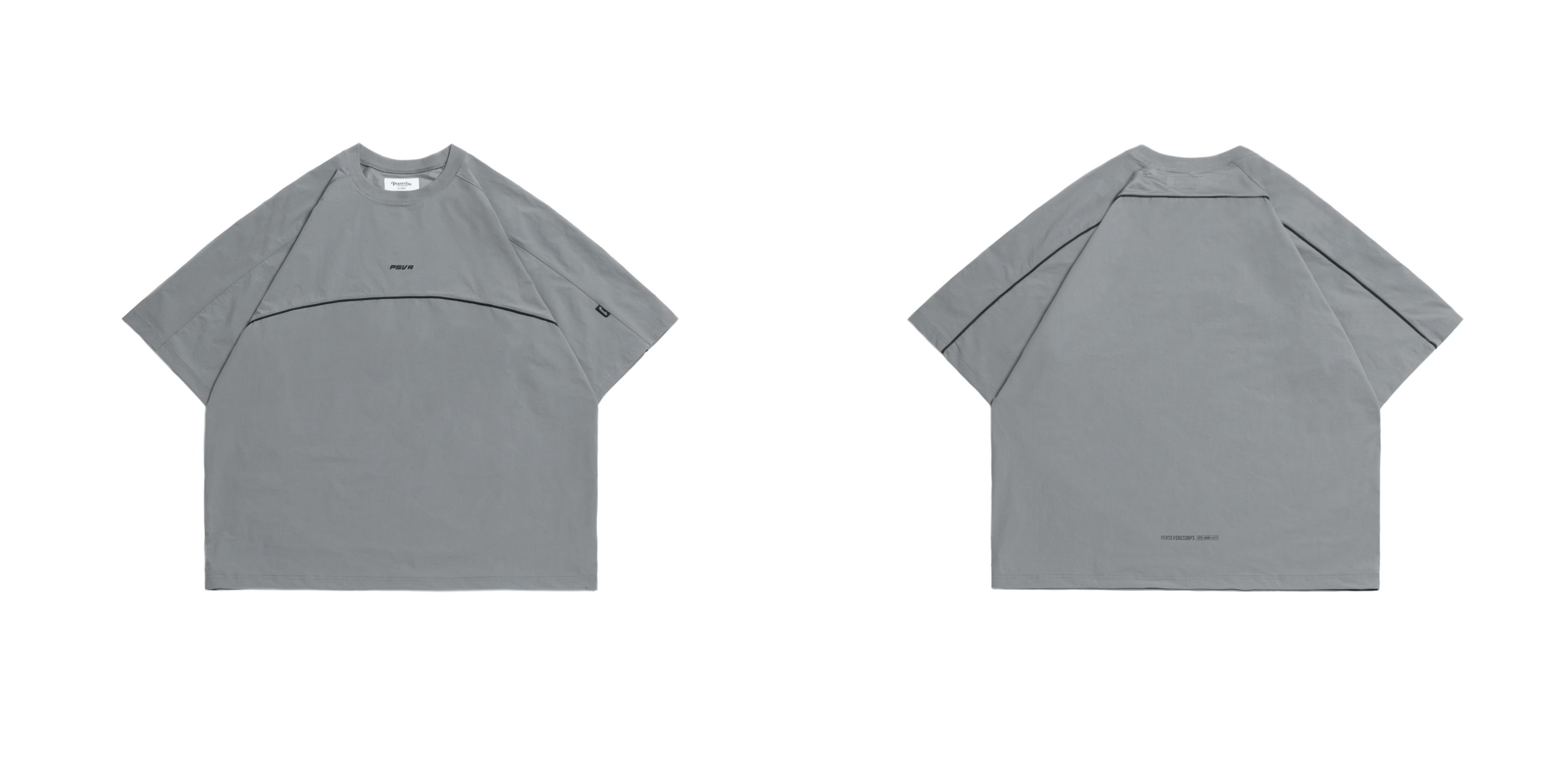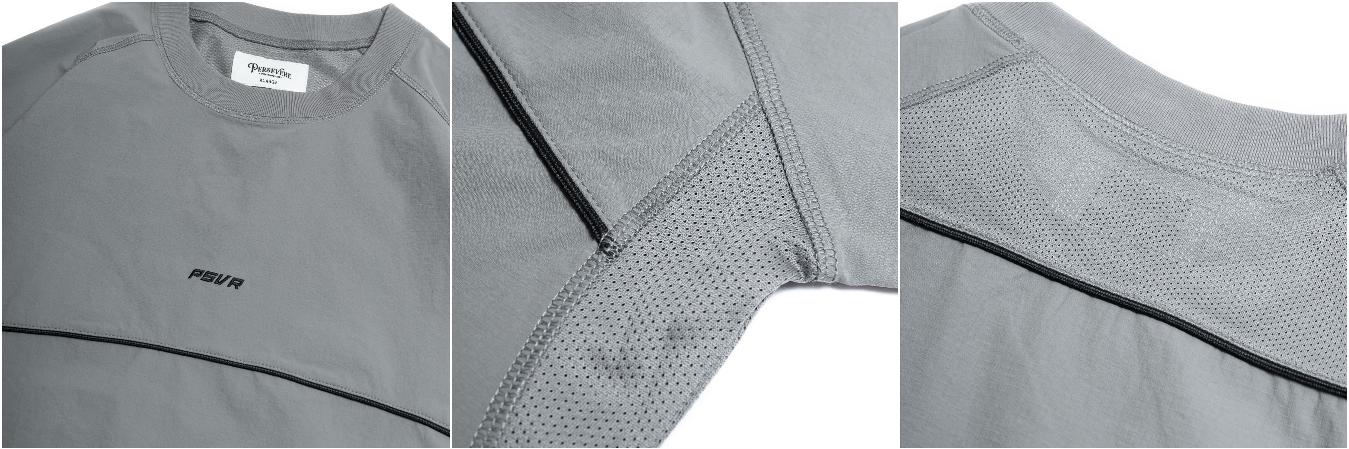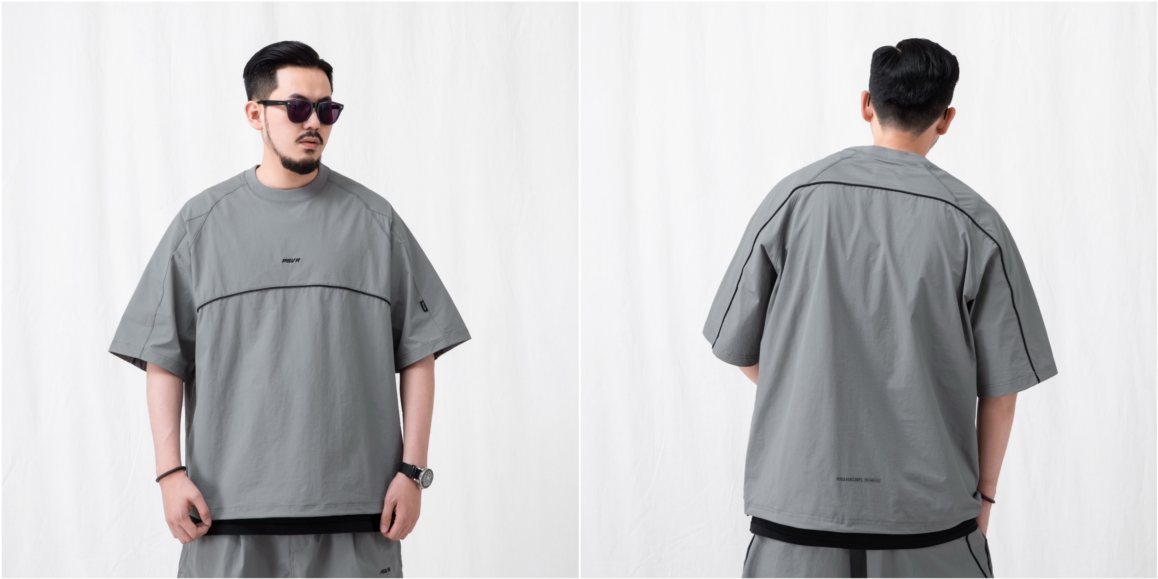 ● 寬鬆落肩的版型設定,以出芽飾邊設計為重點 ( 黑色搭配反光出芽 / 灰色搭配黑色出芽 ),並在後領及腋下使用透氣網布,提升著用的舒適度。