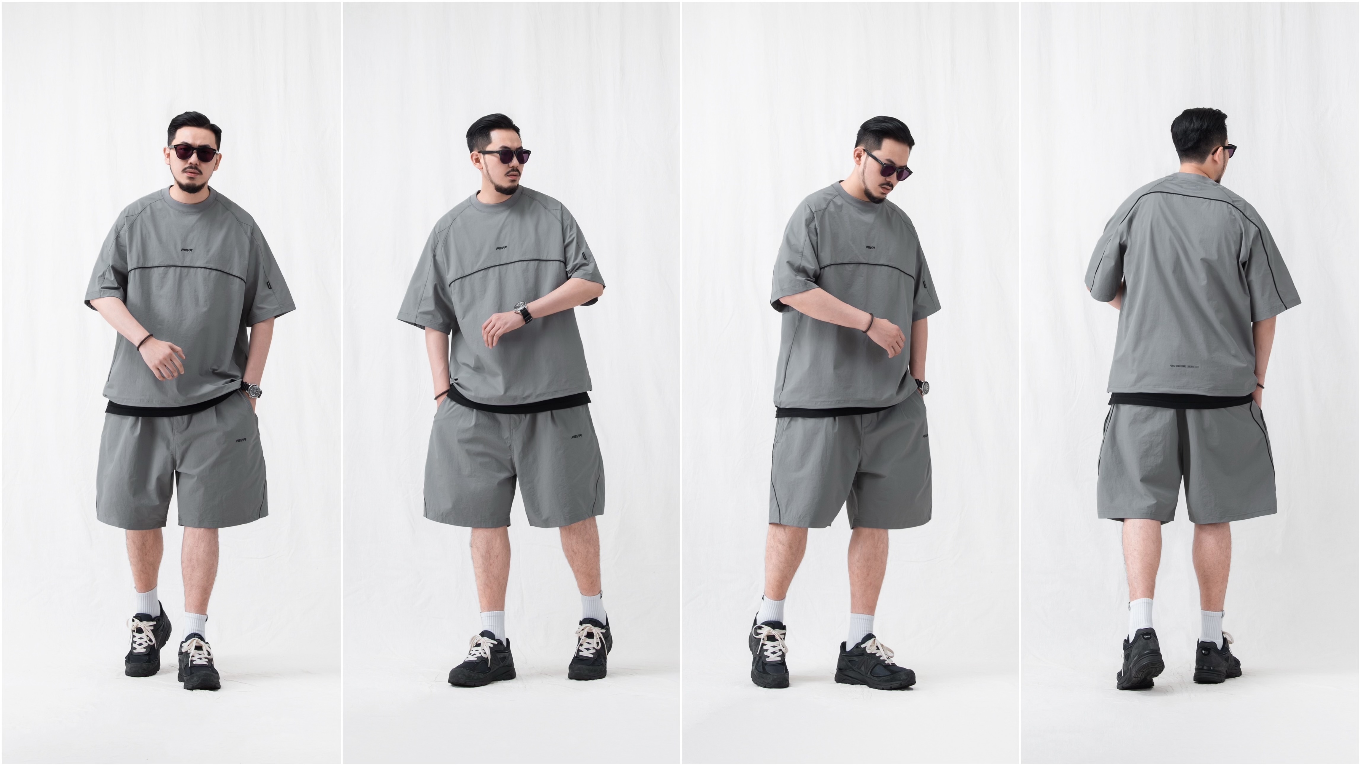 春夏機能戶外套裝 – 舒適彈性防潑水T恤全新發售,特選消光尼龍混紡彈性纖維布料進行製作,搭配剪接出芽飾邊與細部拼接設計,寬鬆落肩的輪廓,採用拷克線、剪接線的縫製方式呈現,手袖剪接細節搭配黑色織標,豐富整體質感。