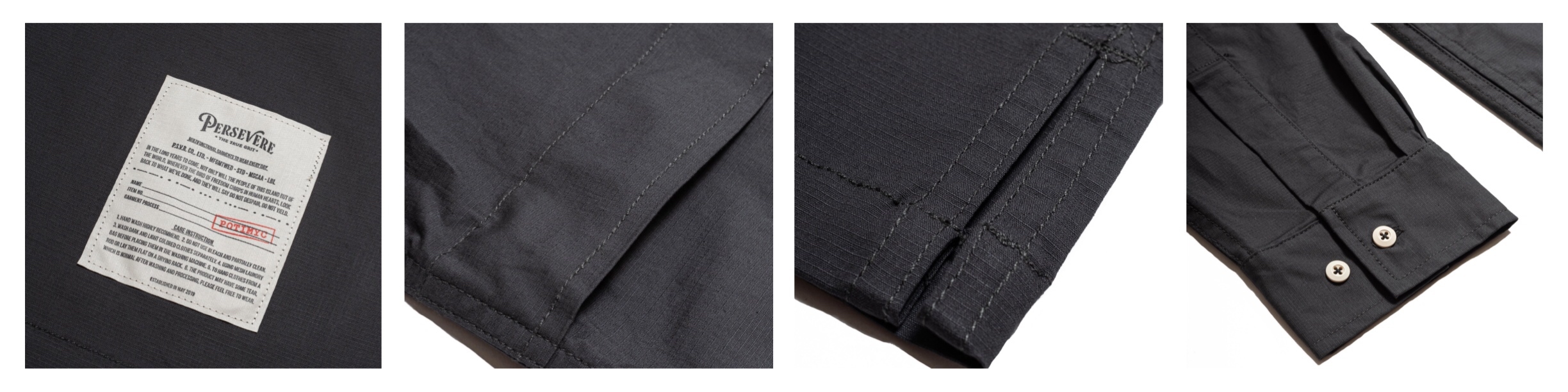 PERSEVERE 秋冬新款工作襯衫正式發售,延續春夏軍裝襯衫的概念,挑選常見軍用抗撕裂布料,重新調整成落肩版型,並設定為寬鬆輪廓,相當合適在季節轉換時作為輕量外搭使用,細節部分,以多重收納為訴求,胸前半立體雙口袋、左胸筆插袋、右胸獨立上開隱藏袋、衣側隱藏手插袋...等等,方便收納手機、鑰匙、皮夾、墨鏡、耳機...等等小物,讓實用功能性大幅提升。