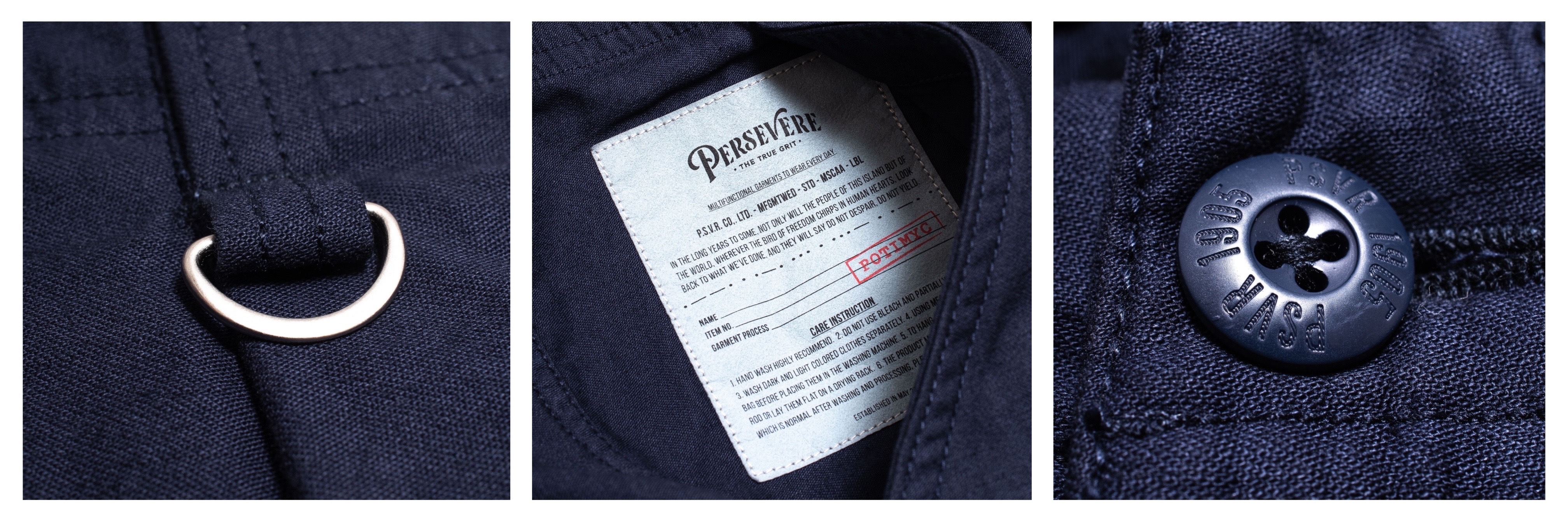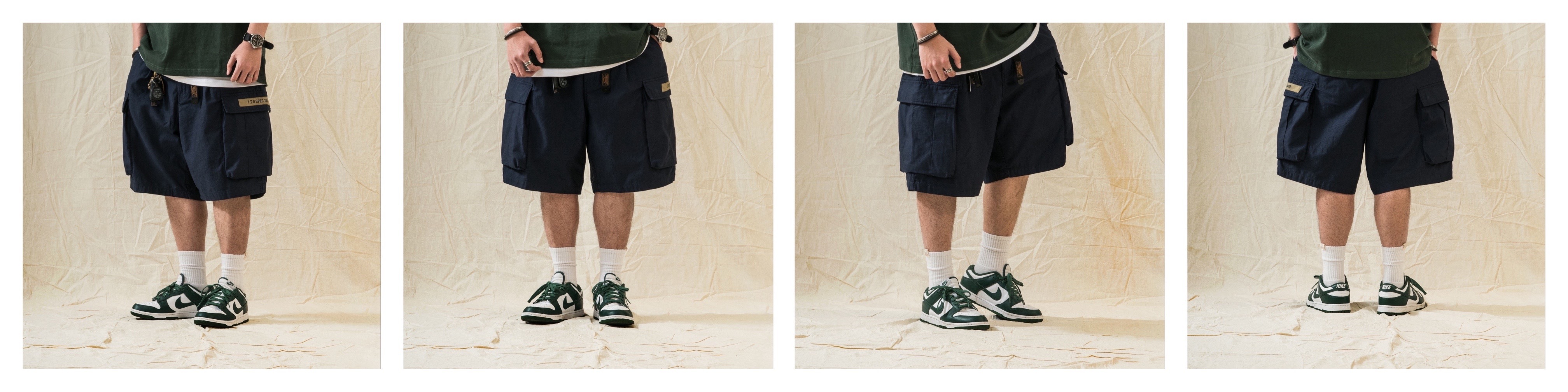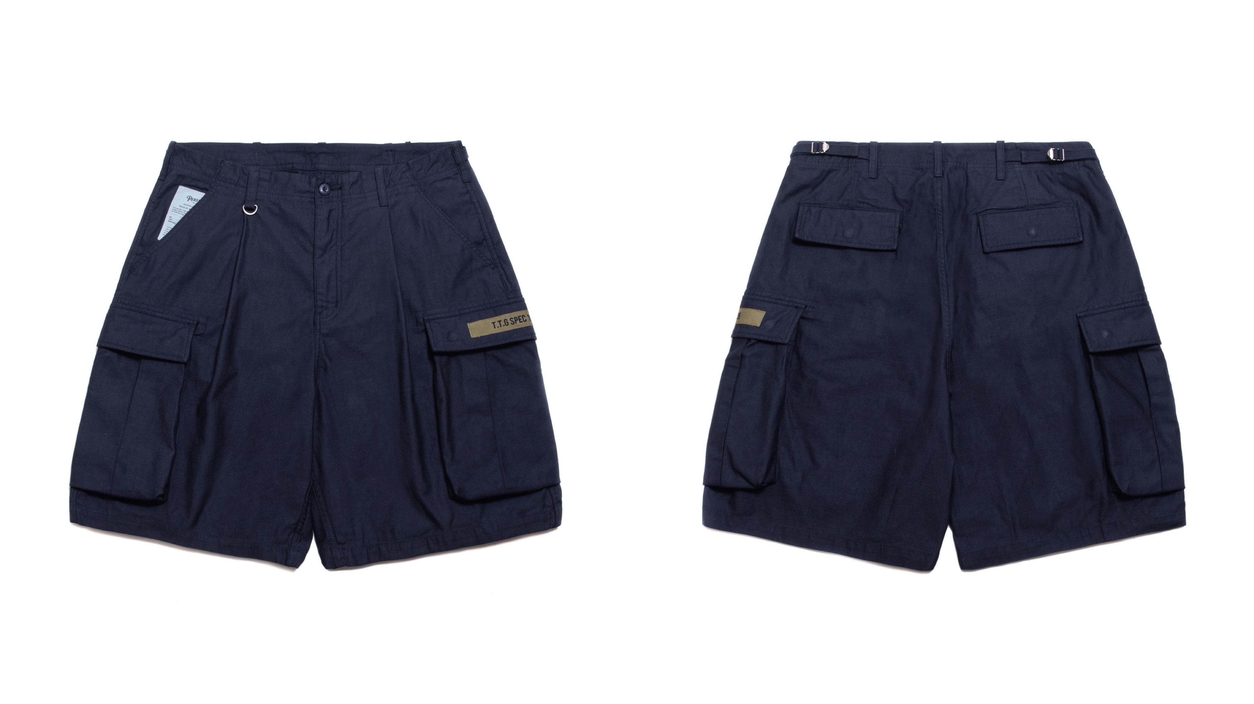 此次軍短褲選用布紋極具特色的日本竹節面料製作,提升穿著時的舒適感與維持褲型的挺度,透過版型的設定規劃,除了維持原本的寬鬆輪廓,另外在前腰圍增加打褶線細節,與細部尺寸重新調整,讓著用著時產生全新的立體感,並採用後染方式染製出全新配色,歷經多次打色後確認選用灰白色、灰綠色、深藍色,三色作為品牌獨家配色,搭配酵石水洗加工,讓整體色澤質感更加自然,同時達成預縮工序,避免清洗後縮水情況產生,細節部分,在口袋增加新版杜邦紙米白標,增添品牌識別度。
