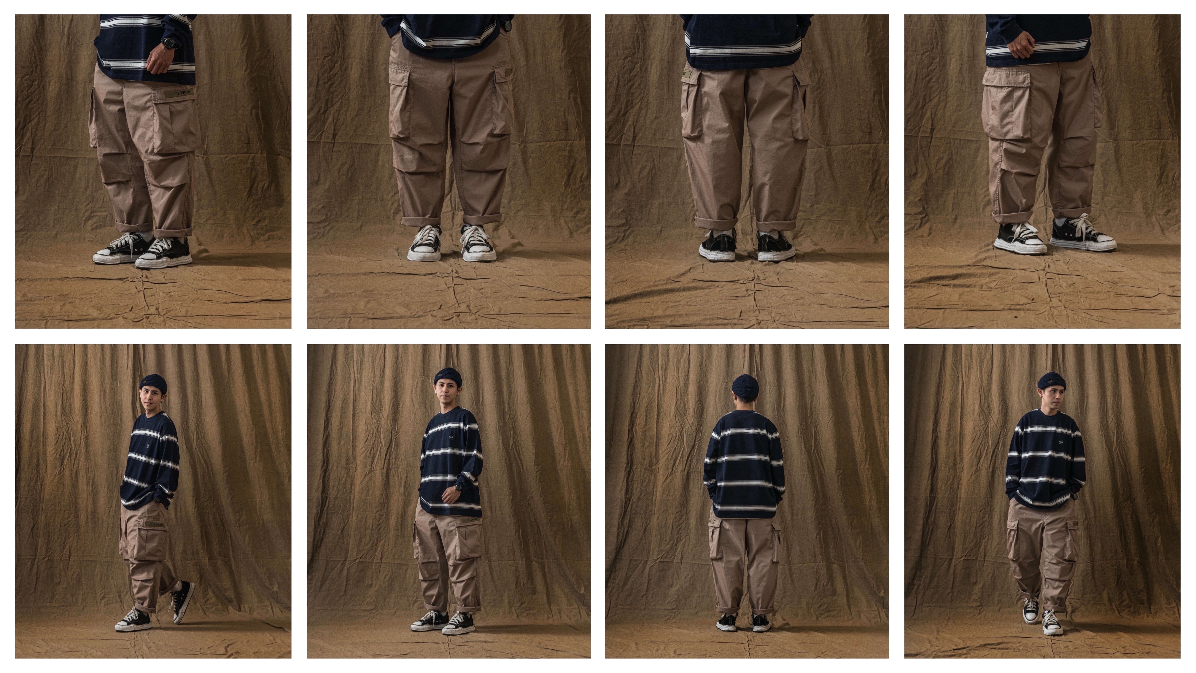 ● 微調版型、增加褲褶線,並維持上寬下窄的錐形輪廓。