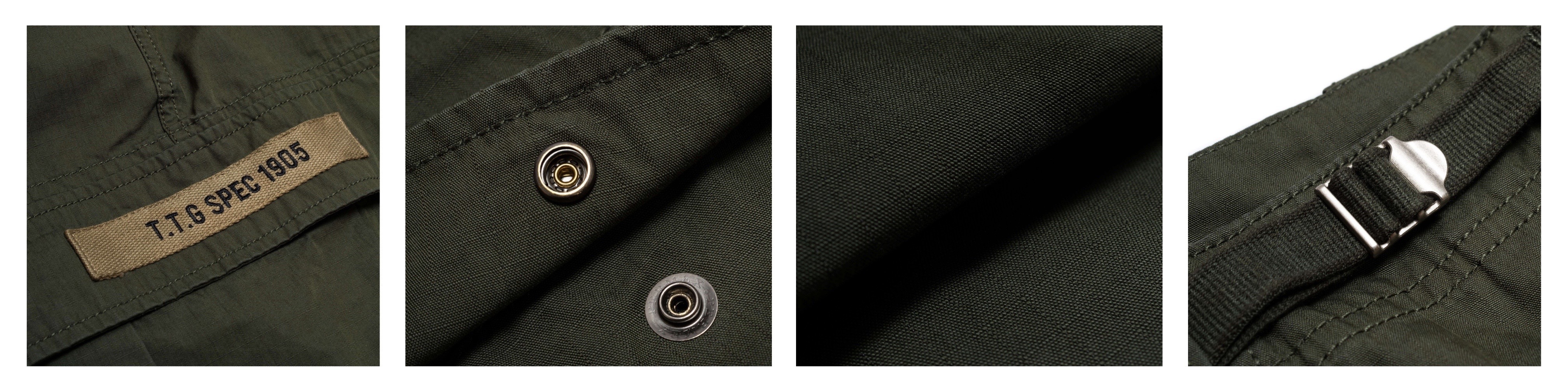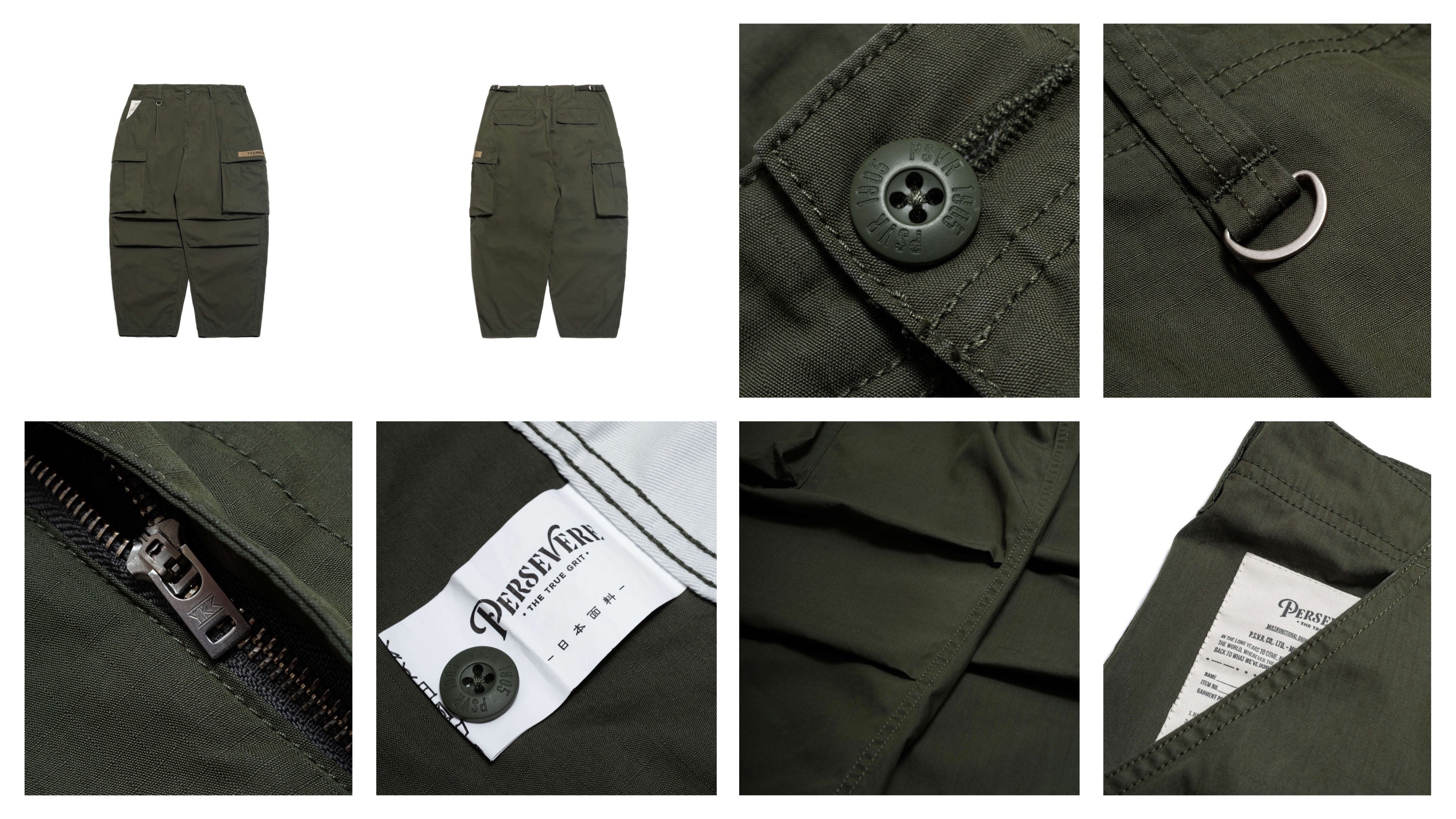 PERSEVERE 2021 年度重磅單品,T.T.G.第三代軍褲升級版本全新發售,品牌成立以來首次使用最高等級的 - 日本進口 RIP-STOP 面料進行製作,以 70% COTTON + 30% NYLON 混紡而成並加上塗層加工,輕量化的同時擁有高密度、高強度、耐磨、透氣、抗風、抗撕裂..等特性,讓著用時的立體度變得相當出色,並透過水洗工序讓布料呈現些微水洗與細緻的光澤感。