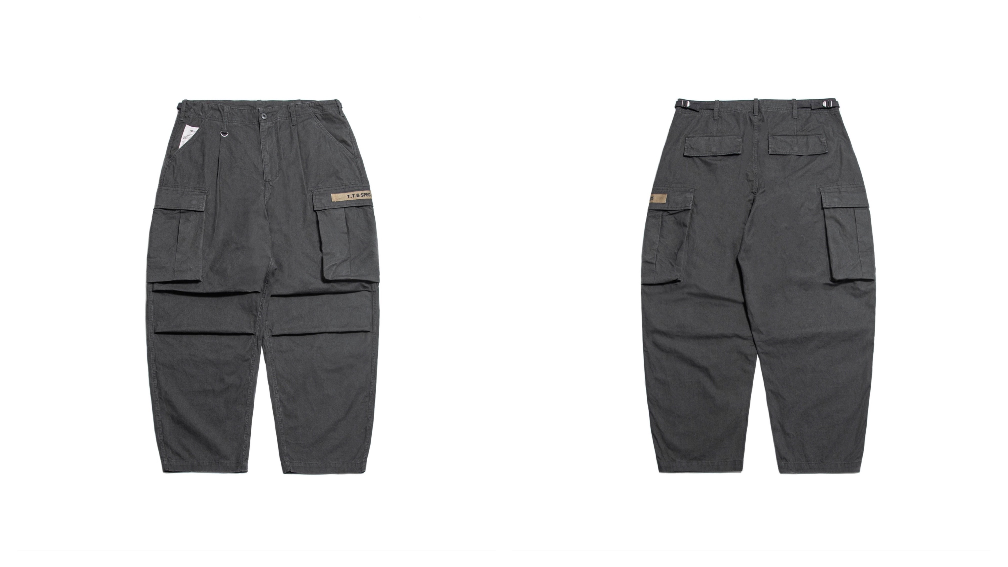 以第三代 T.T.G. 軍褲為基礎,牛仔色挑選13OZ丹寧面料製作,透過酵石水洗加工,呈現自然的著用色落感;另外煙灰色挑選厚薄適中,布性挺拔紮實的日本十字竹節面料,進行染製作業,搭配後加工石洗工序,呈現自然洗舊感的獨特煙灰色調。