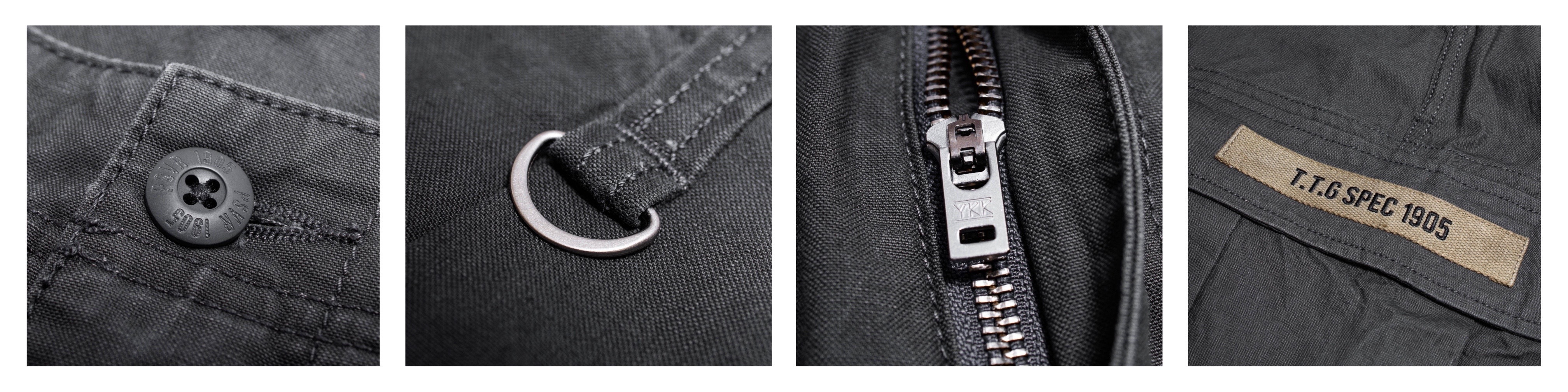 ● 三代 T.T.G. 軍褲版型為主、保留褲褶線並維持上寬下窄的錐形輪廓。