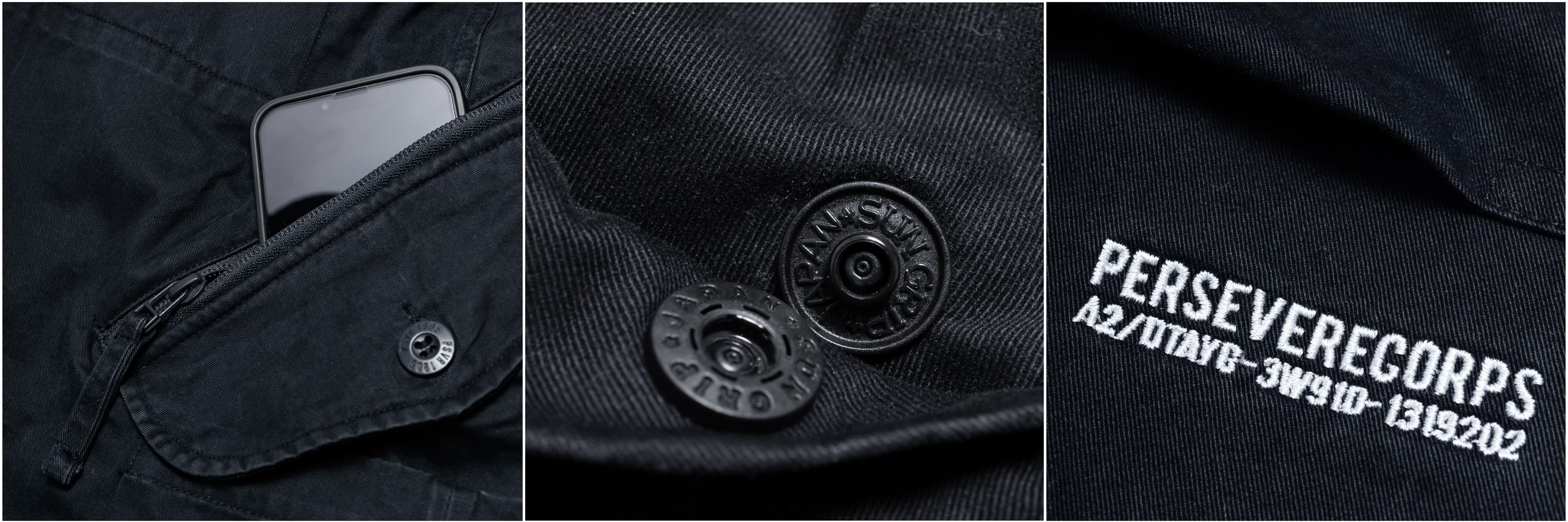 ● 安排品牌獨家尿素釦,搭配YKK拉鍊、日本SUN GRIP壓釦與品牌電繡圖樣,增添細節的使用手感與質感。