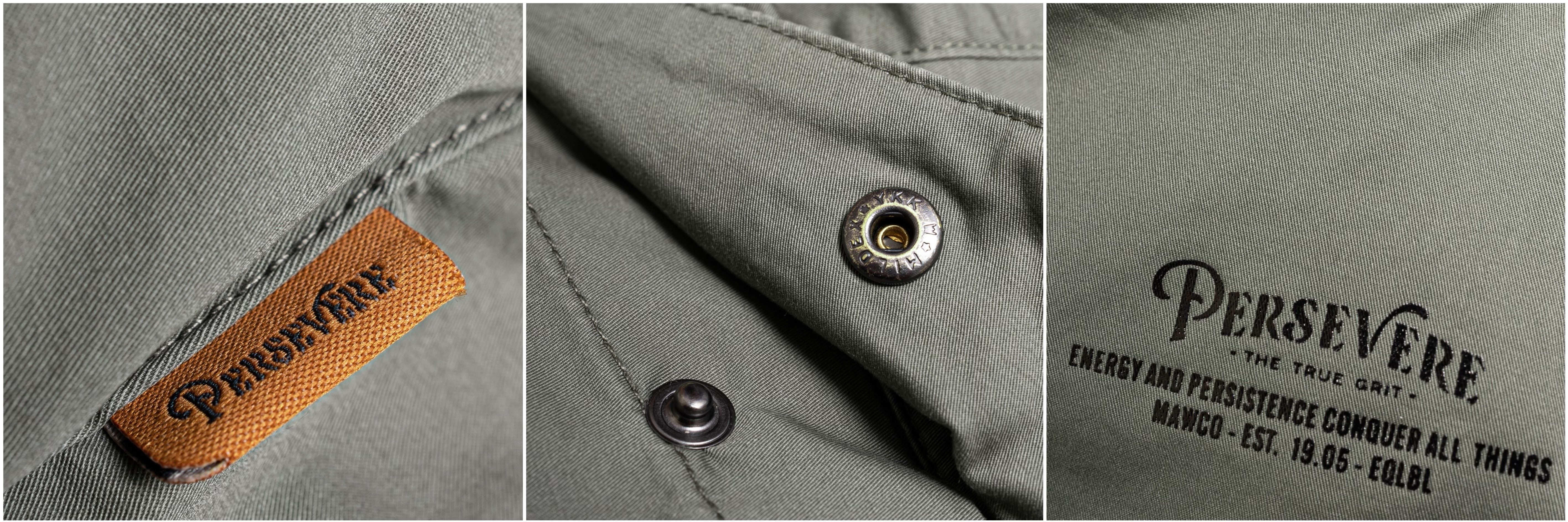 ● 細節處安排品牌識別印刷與橘色織標,搭配品牌獨家尿素釦,加強整體視覺質感。