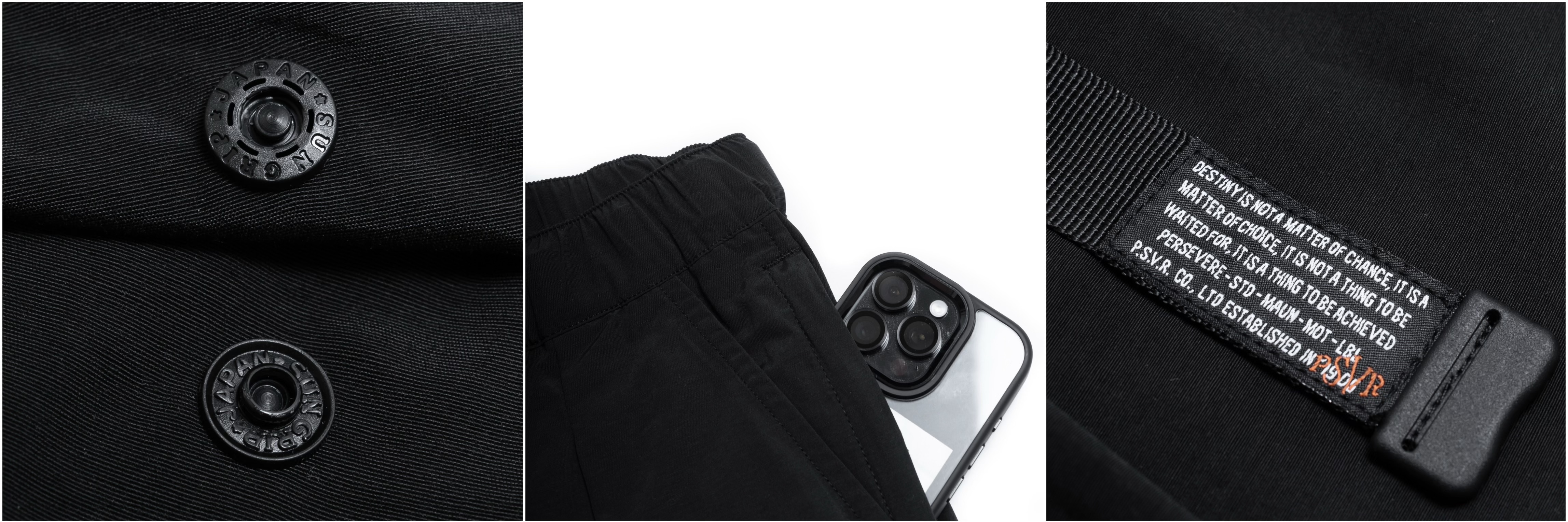 ● 細節處安排同布色拉繩、品牌織帶拉繩、尿素釦、黑色、橘色織標,搭配日本製 Sun Grip 壓釦與磁吸釦,提升整體質感。
