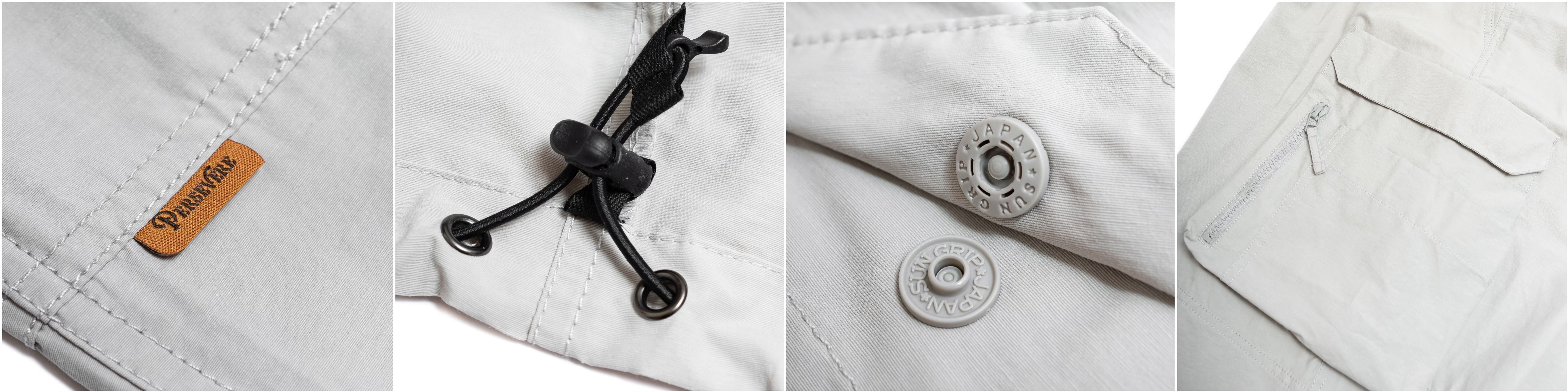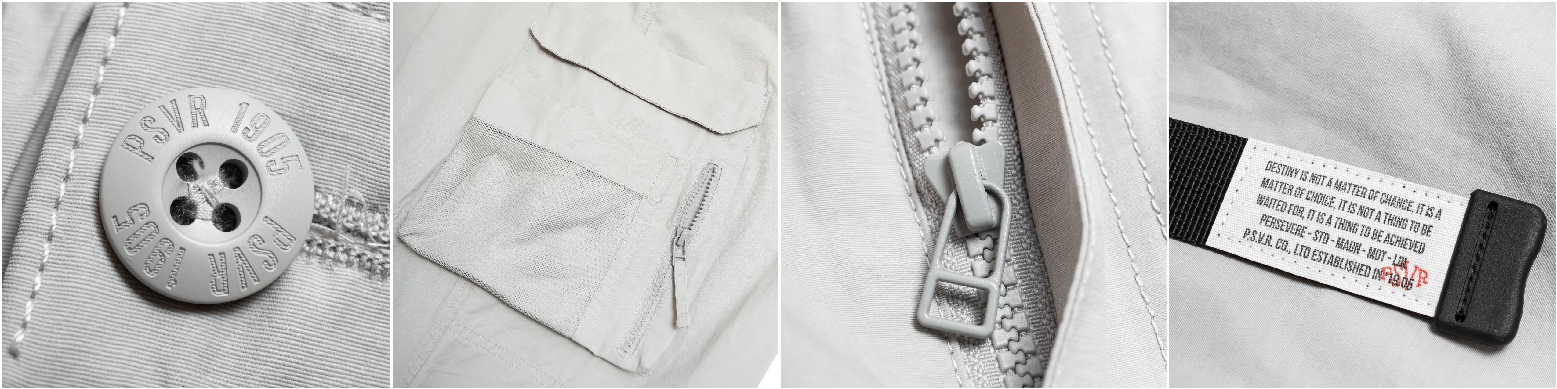 ● 選用具有紋理特色的半消光 N/C 面料製作,材質帶有防潑水、抗皺的機能性。