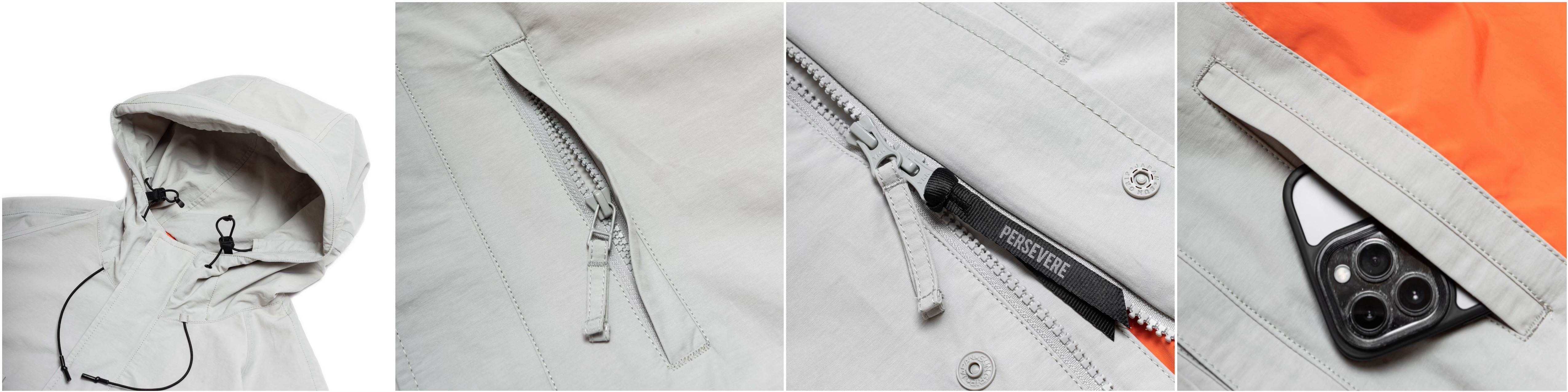 ● 選用具有紋理特色的半消光 N/C 面料製作,材質帶有防潑水、抗皺的機能性,並搭配橘色高密度防風內裡。