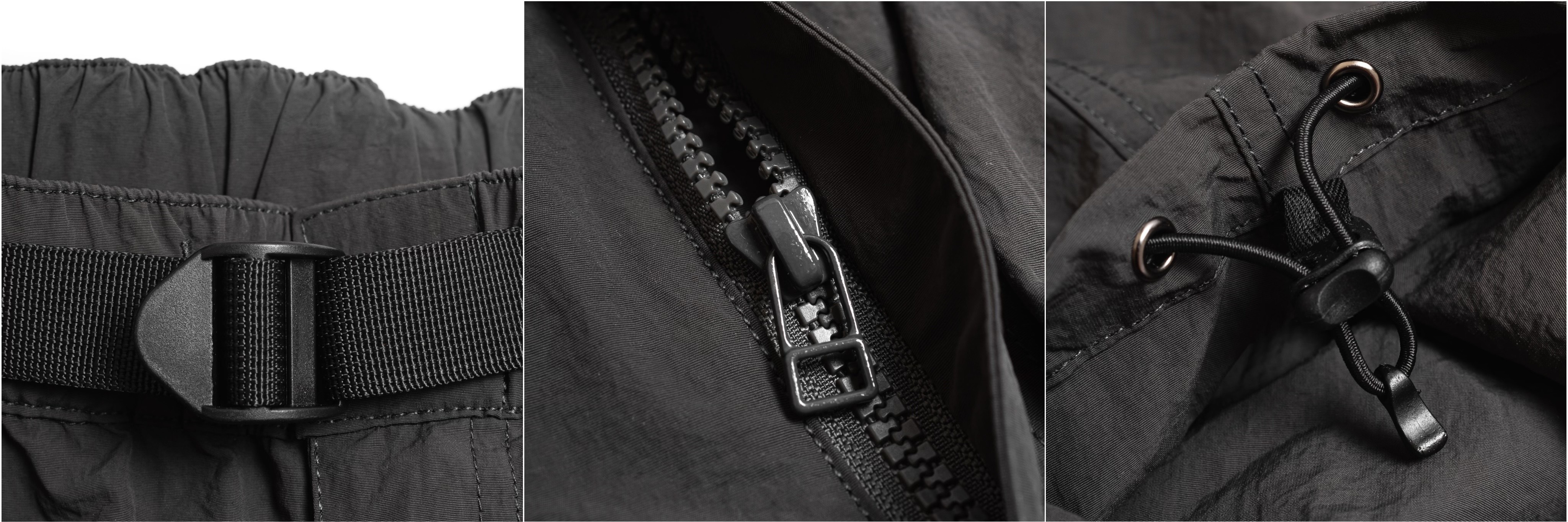 ● 褲腳內側增加抽繩扣具細節,提供三種褲腳型態的變化,滿足不同穿搭造型感。