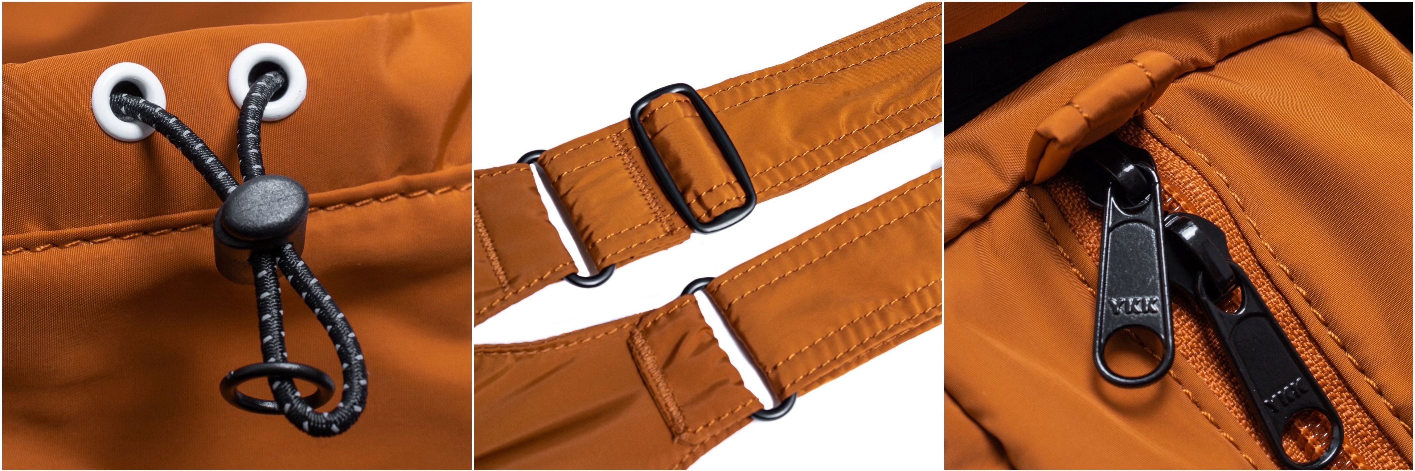 ● 多重收納功能設定,輔料搭配YKK拉鍊、彈性拉繩、魔鬼氈作為開合使用,提高日常使用的實用性。
