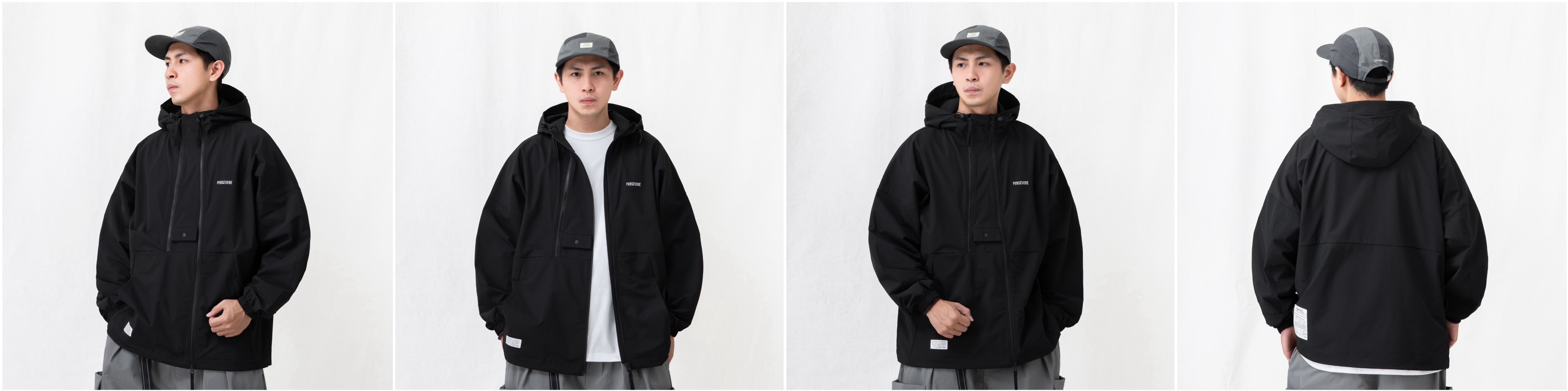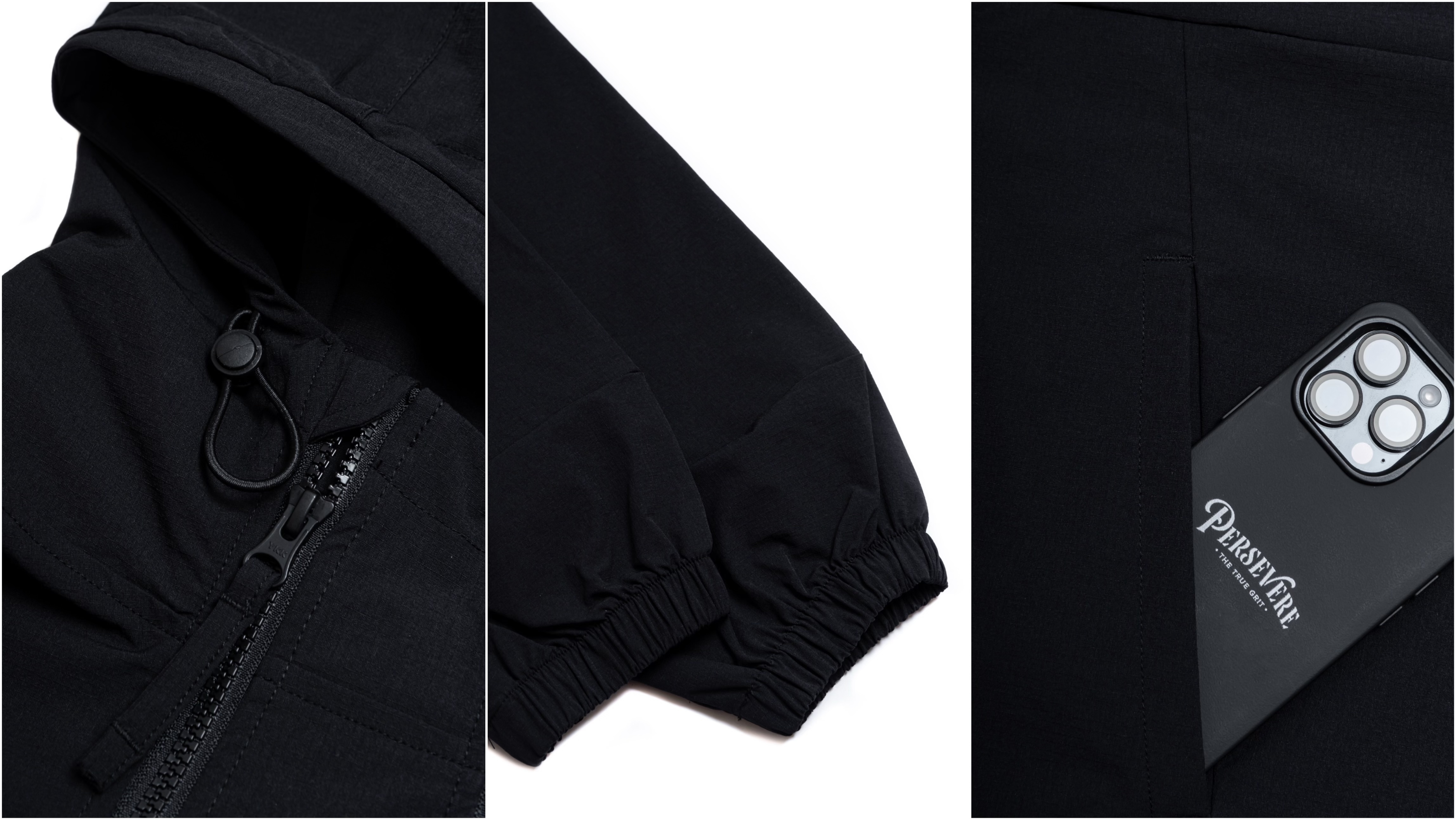 ● 輔料使用高質感的YKK消光雙拉鍊,搭配日本Sun Grip壓釦小收納袋、連帽調節扣具、袖口彈性帶,提升穿著便利度及抗風性。