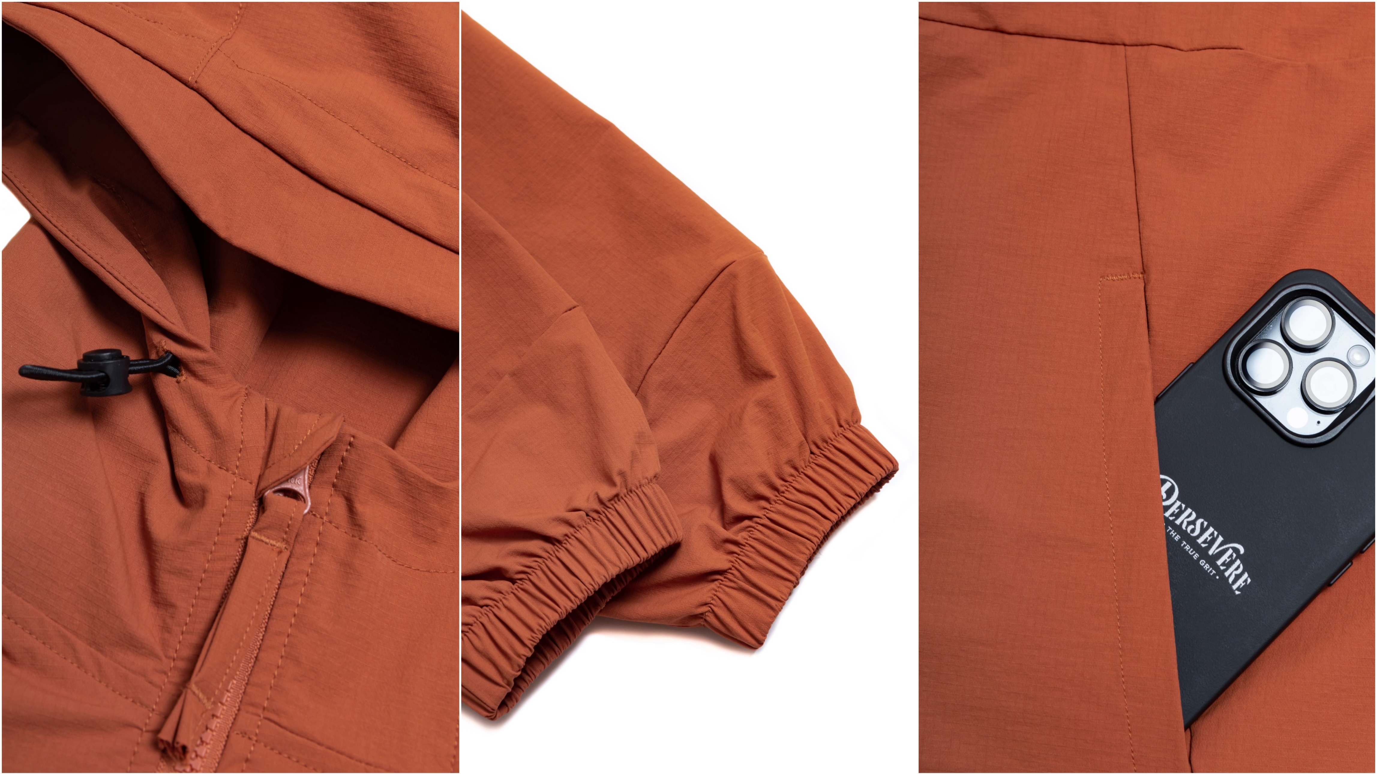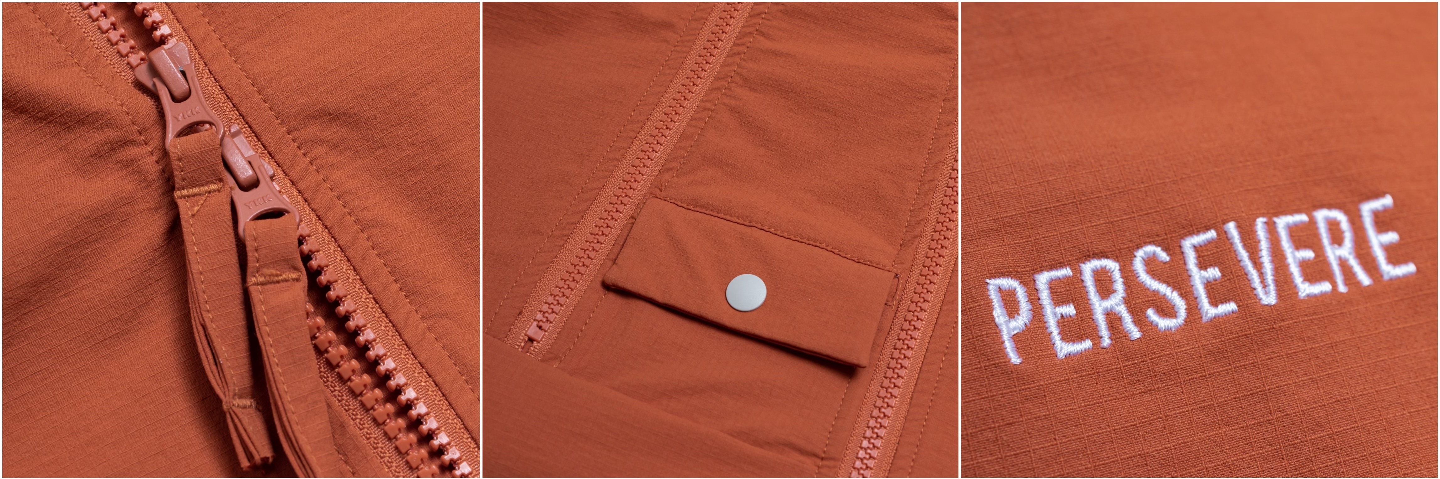 ● 輔料使用高質感的YKK消光雙拉鍊,搭配日本Sun Grip壓釦小收納袋、連帽調節扣具、袖口彈性帶,提升穿著便利度及抗風性。