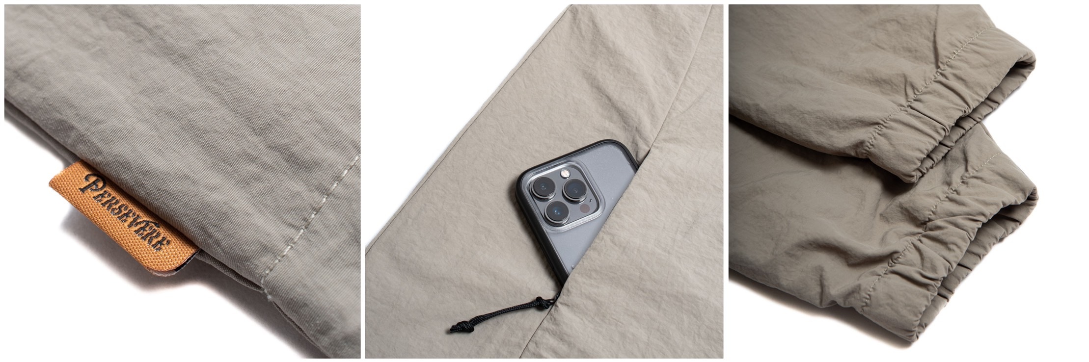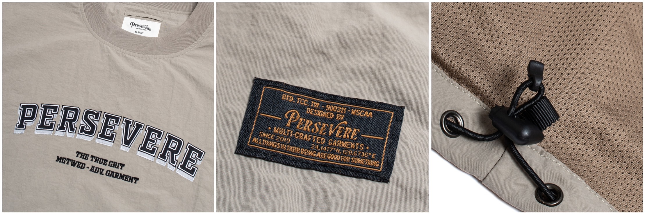 PERSEVERE 秋冬防潑水尼龍大學T恤全新發售,以機能性為發想起點,特別挑選具有防潑水、抗風、耐磨特性的微抓皺的尼龍面料,搭配柔軟的網布內裡,提升穿著時的份量感與透氣舒適度,並透過貼布繡方式呈現 PERSEVERE 標誌,與電繡的品牌標語相互輝映,寬鬆剪裁的版型設定,增加隱藏式口袋及抽繩細節,透過抽繩調節變化,轉換不同的穿搭造型感。