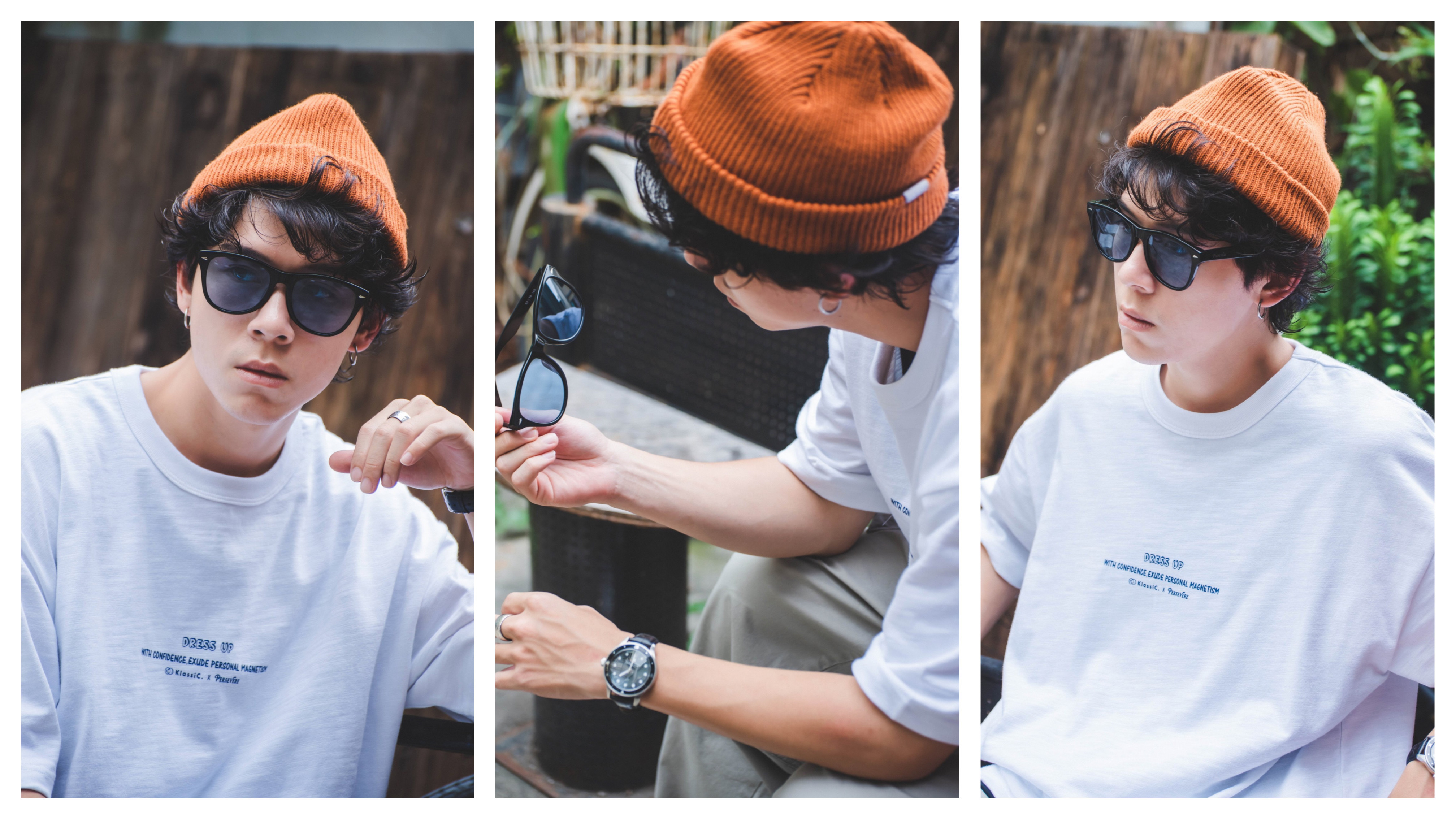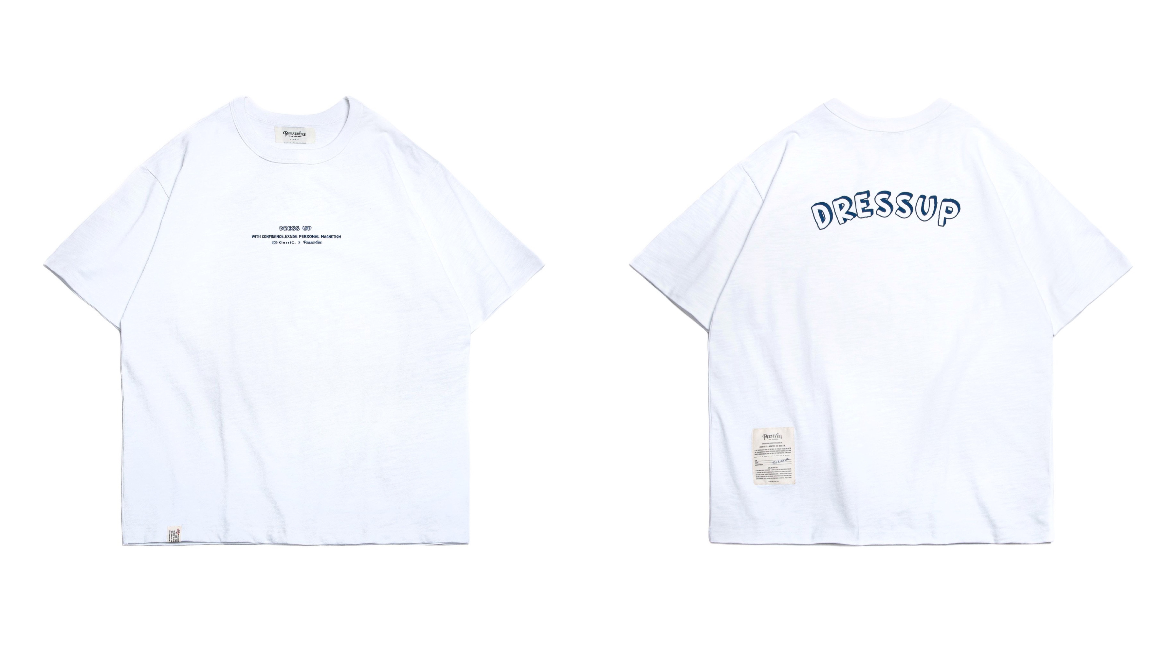 將連乘主題 " Dress up " 視覺化, 透過手繪感的鏤空字體呈現,搭配文字註解說明,簡單俐落的休閒風格,並選用高磅數竹節布料製作,寬鬆版型配置大小雙織標細節,再以外包車縫方式固定加厚羅紋包覆領口,防止變形也大幅提升耐穿度。