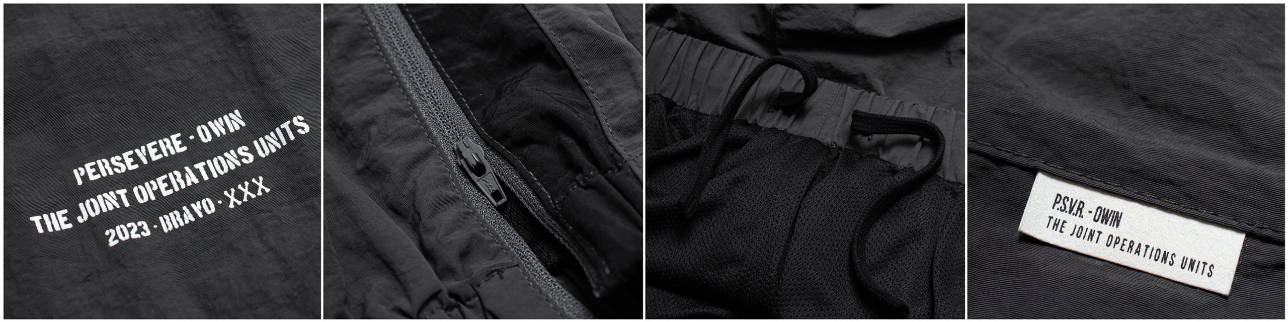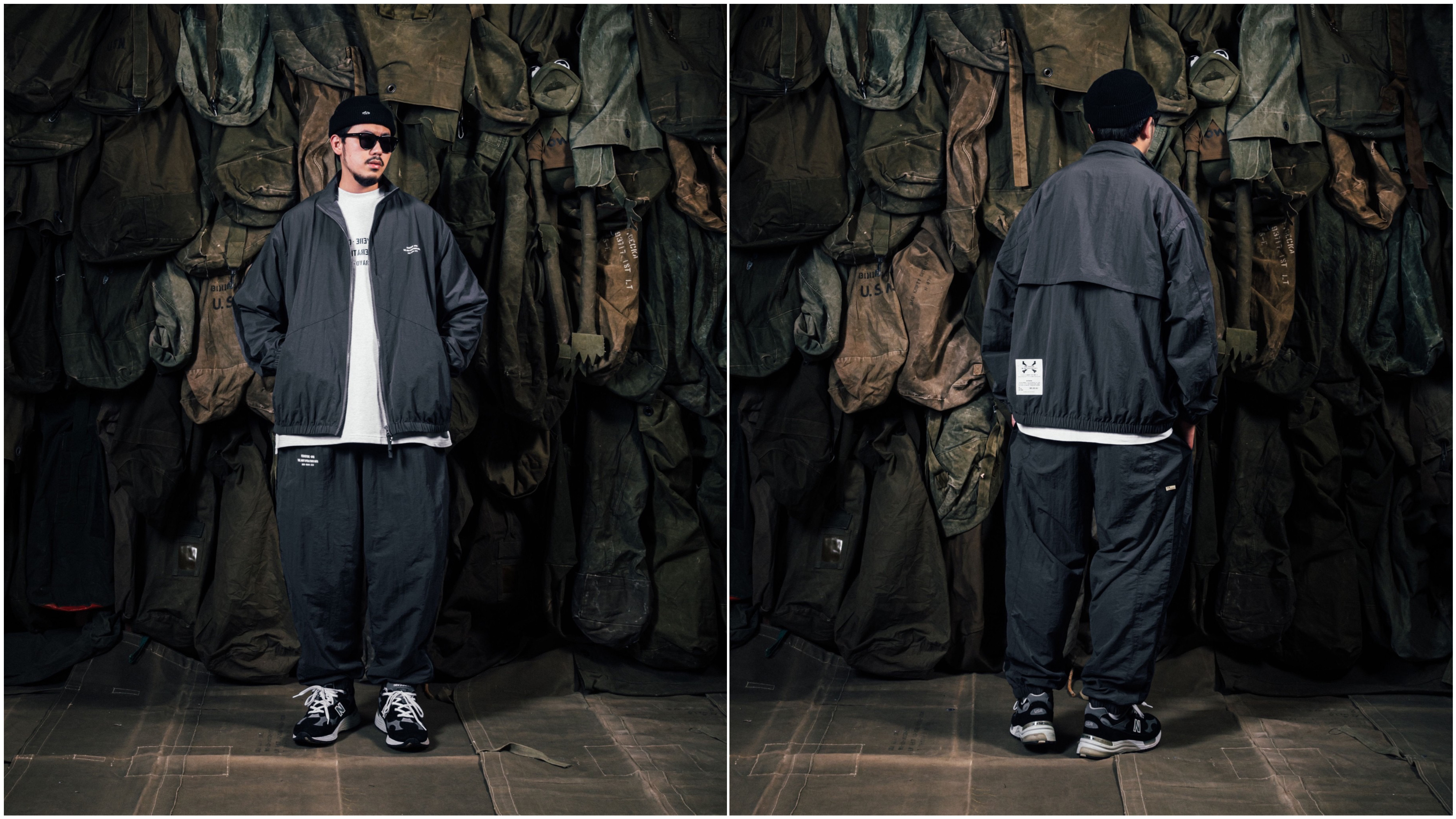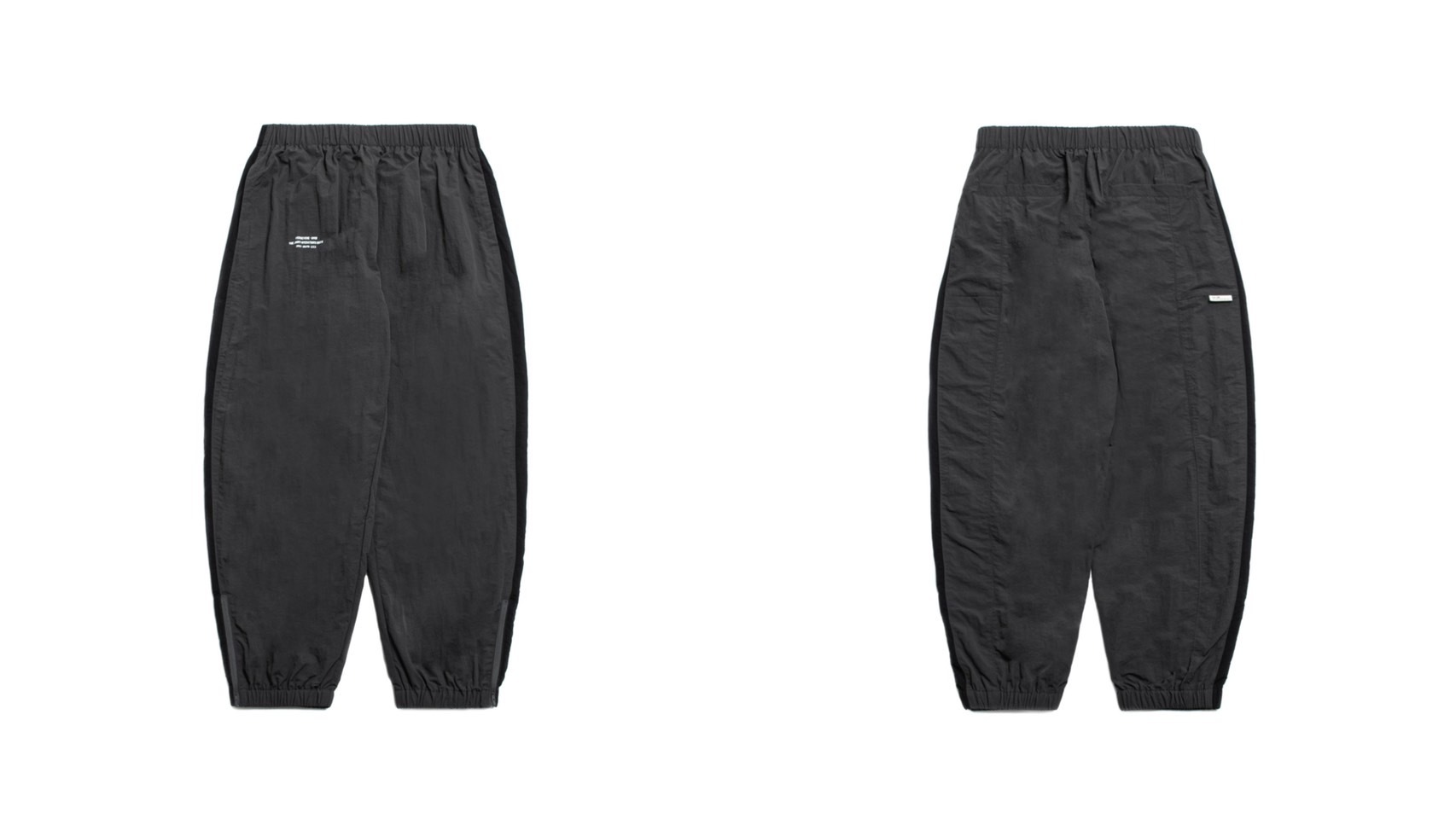 以90年代大熱的 TRACKSUIT 為發想,捨棄鮮豔色調,改以沈穩的鐵灰色表現,使用具有防風、防潑水的高密度尼龍布料製作,搭配舒適透氣的網眼裡布,版型重新設定為寬鬆輪廓,並在側邊增加拼接及立體剪接設計,另外配置數個魔鬼氈收納袋與手插袋,加強收納實用性。