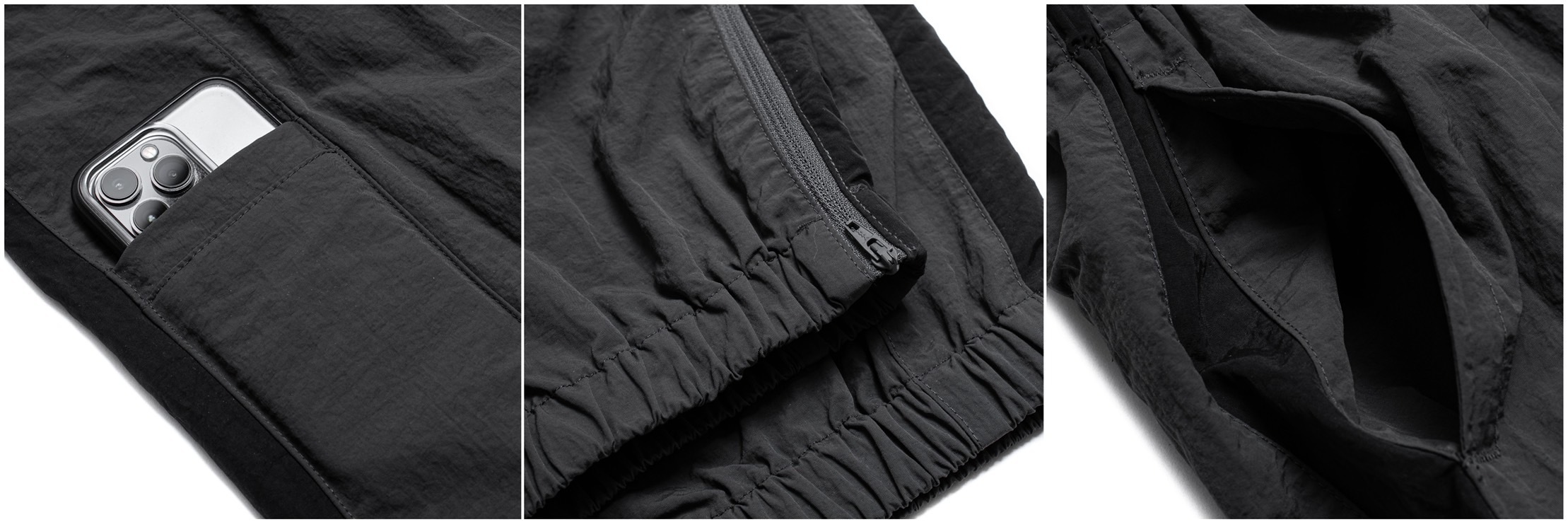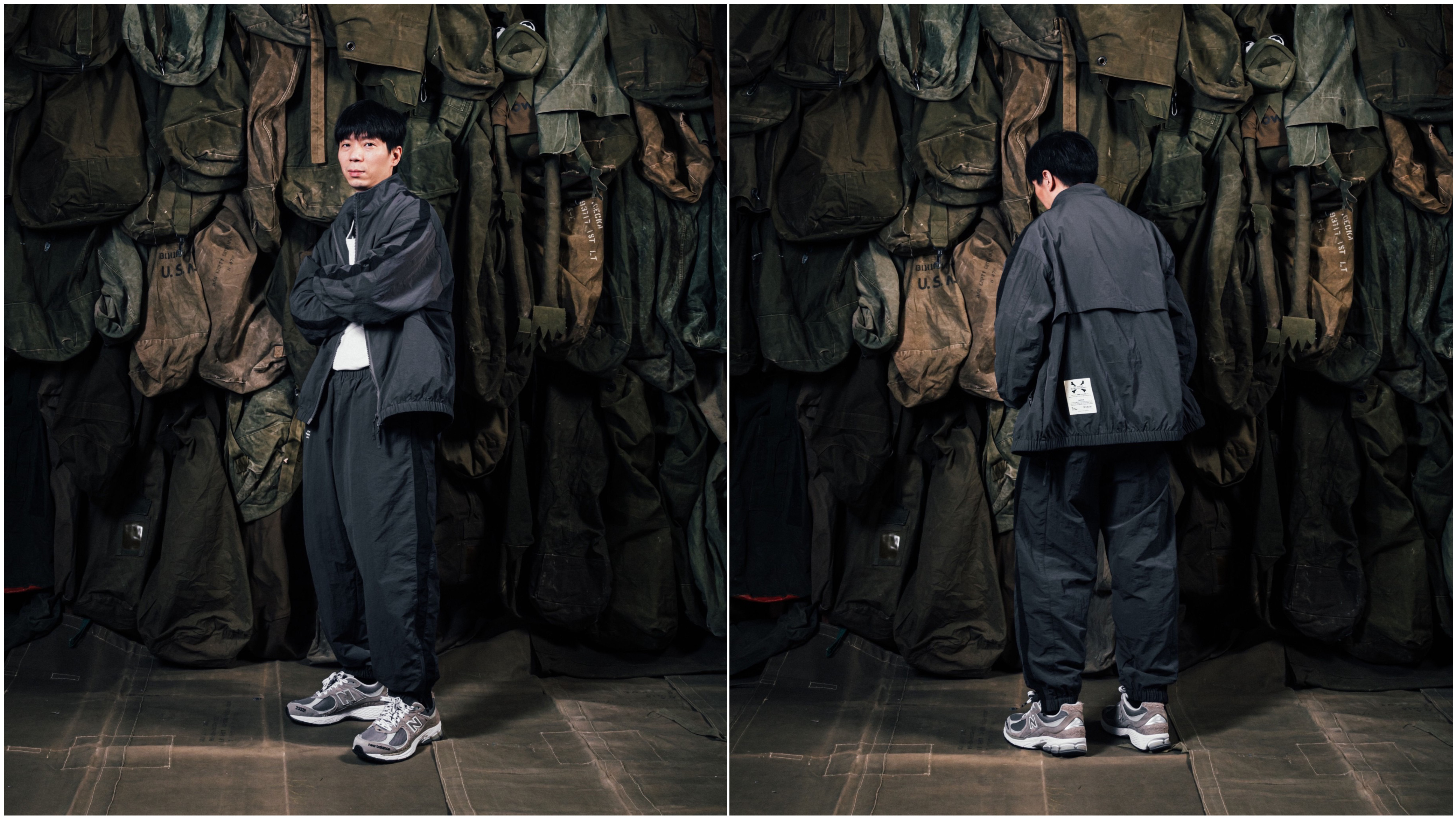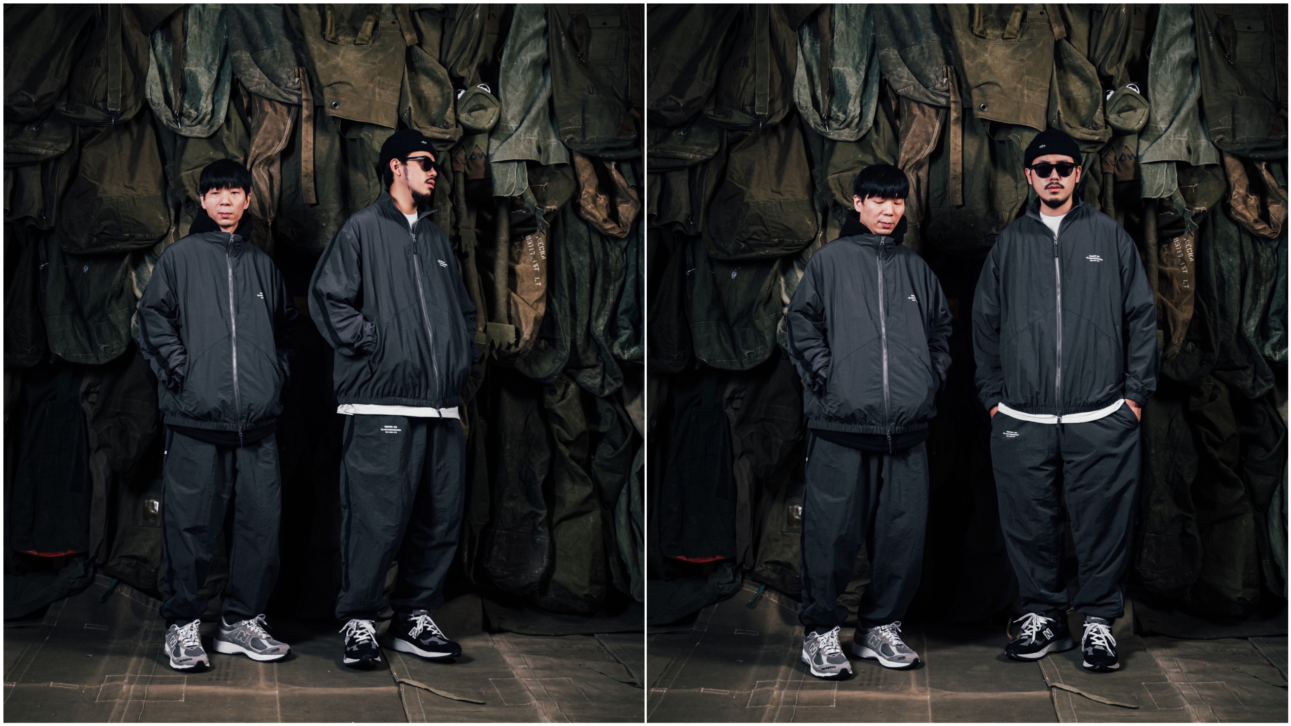 以90年代大熱的 TRACKSUIT 為發想,捨棄鮮豔色調,改以沈穩的鐵灰色表現,使用具有防風、防潑水的高密度尼龍布料製作,搭配舒適透氣的網眼裡布,版型重新設定為寬鬆輪廓,並在側邊增加拼接及立體剪接設計,另外配置數個魔鬼氈收納袋與手插袋,加強收納實用性。
