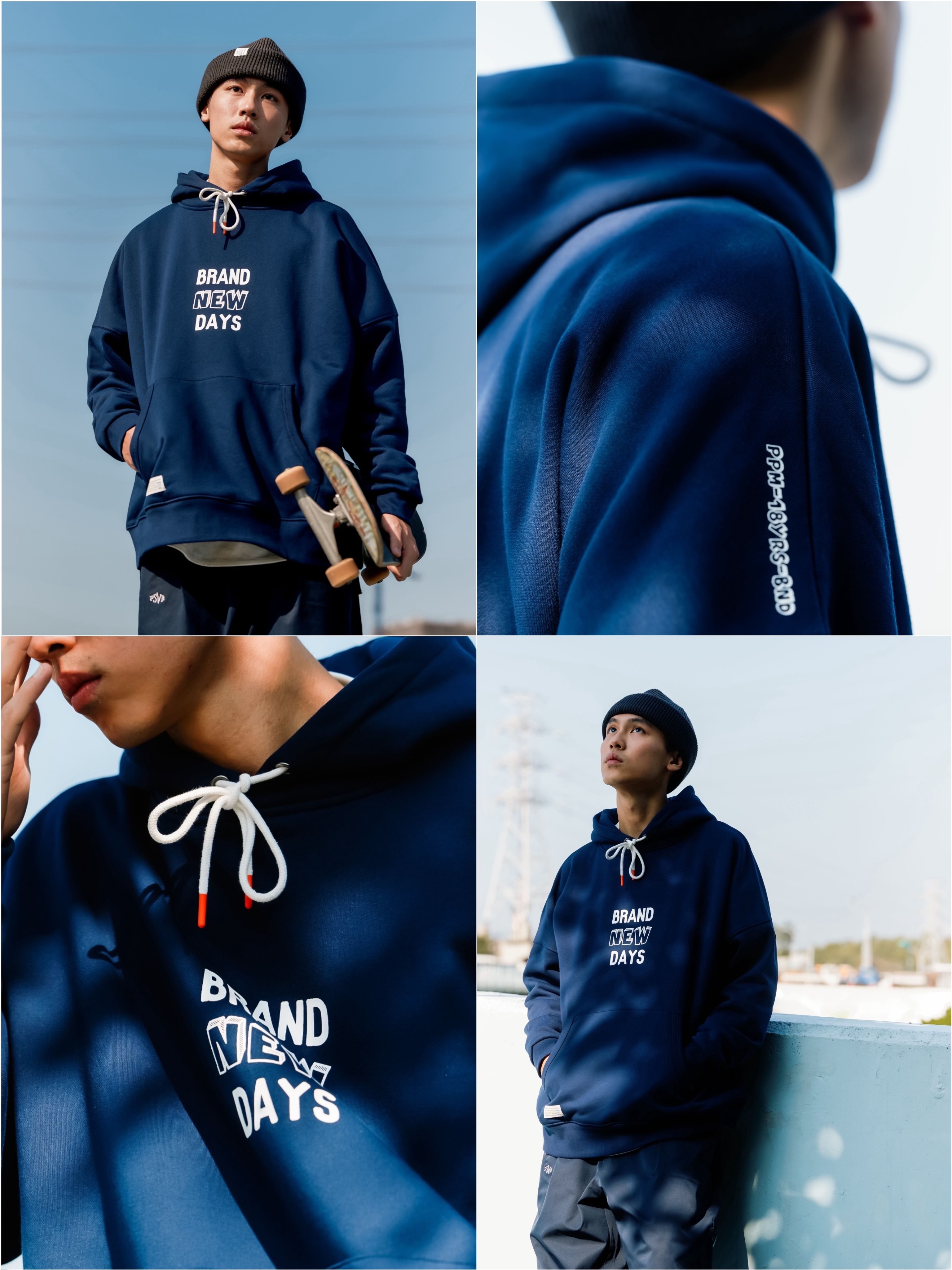 將雙方合作主題 “ Brand new days ” 以立體印刷方式呈現在棉質的刷毛面料上,並採用 Persevere 的經典特殊落肩版型,傳達出輕鬆休閒的氛圍,搭配撞色的抽繩繩頭細節、雙品牌聯名大小織標,提升整體視覺豐富度。