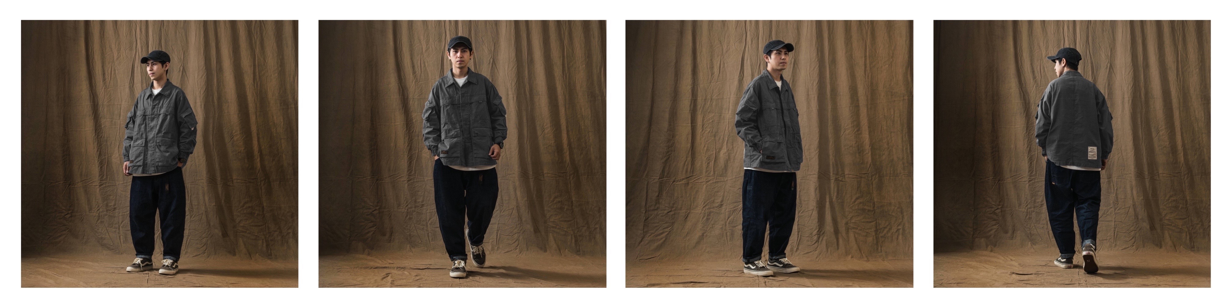 ● 配置4個外顯、4個隱藏式口袋細節,提升實用功能性,並使用粗棉線搭配鎖鍊車方式進行車縫,大幅增加耐穿程度。