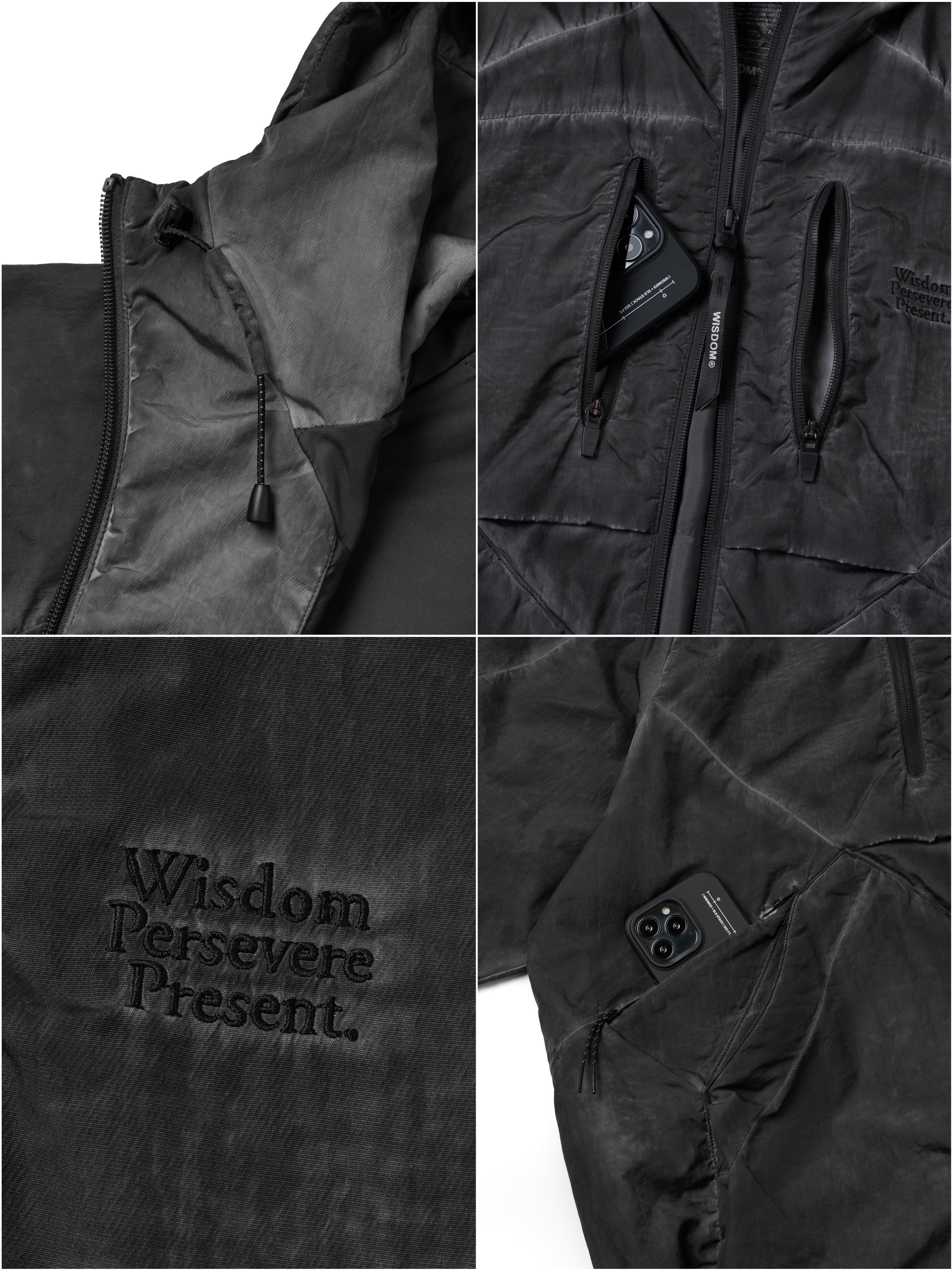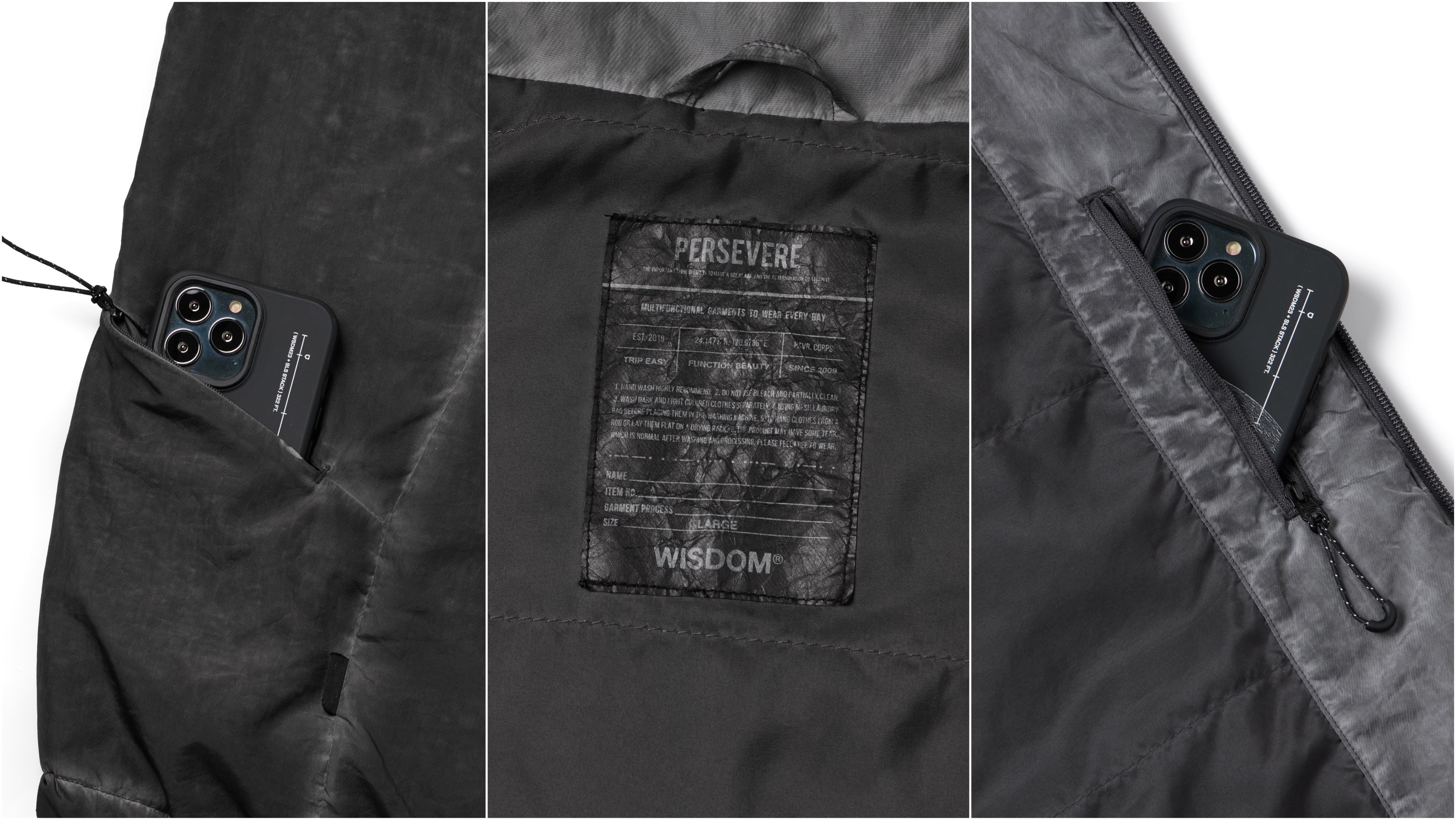 以“ LOOMED ECHOES ” 的概念形塑,WISDOM® 與PERSEVERE 攜手合作STYLE 04高機能多口袋鋪棉連帽外套,由零開啟布料形式設定,將科技機能面料融入染製水洗及防潑水工序製程,並分別應用在不同的顏色設定,透過版型剪裁與口袋配置,增加實用性,內裡選用保溫棉,提升冬日禦寒係數。