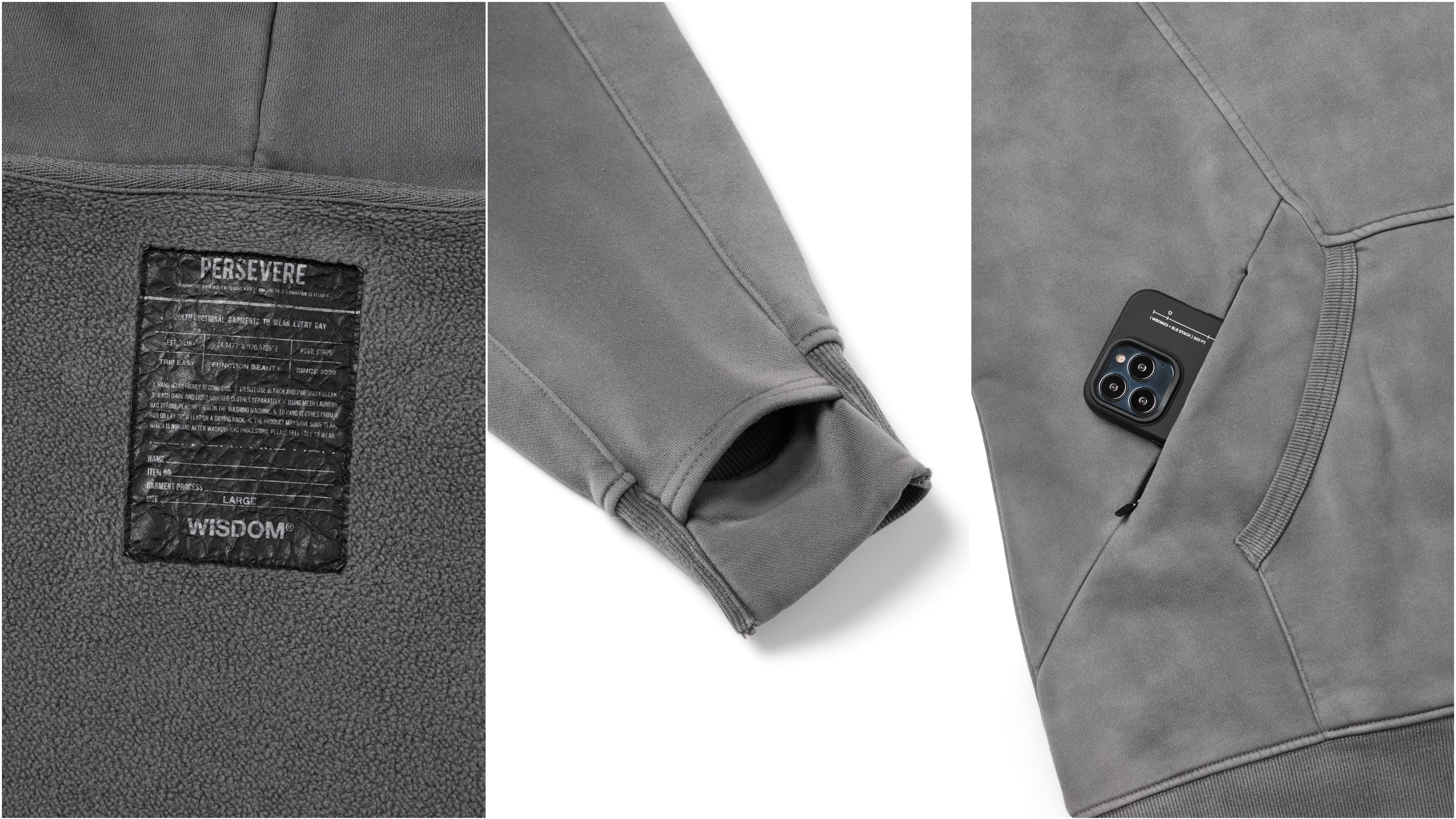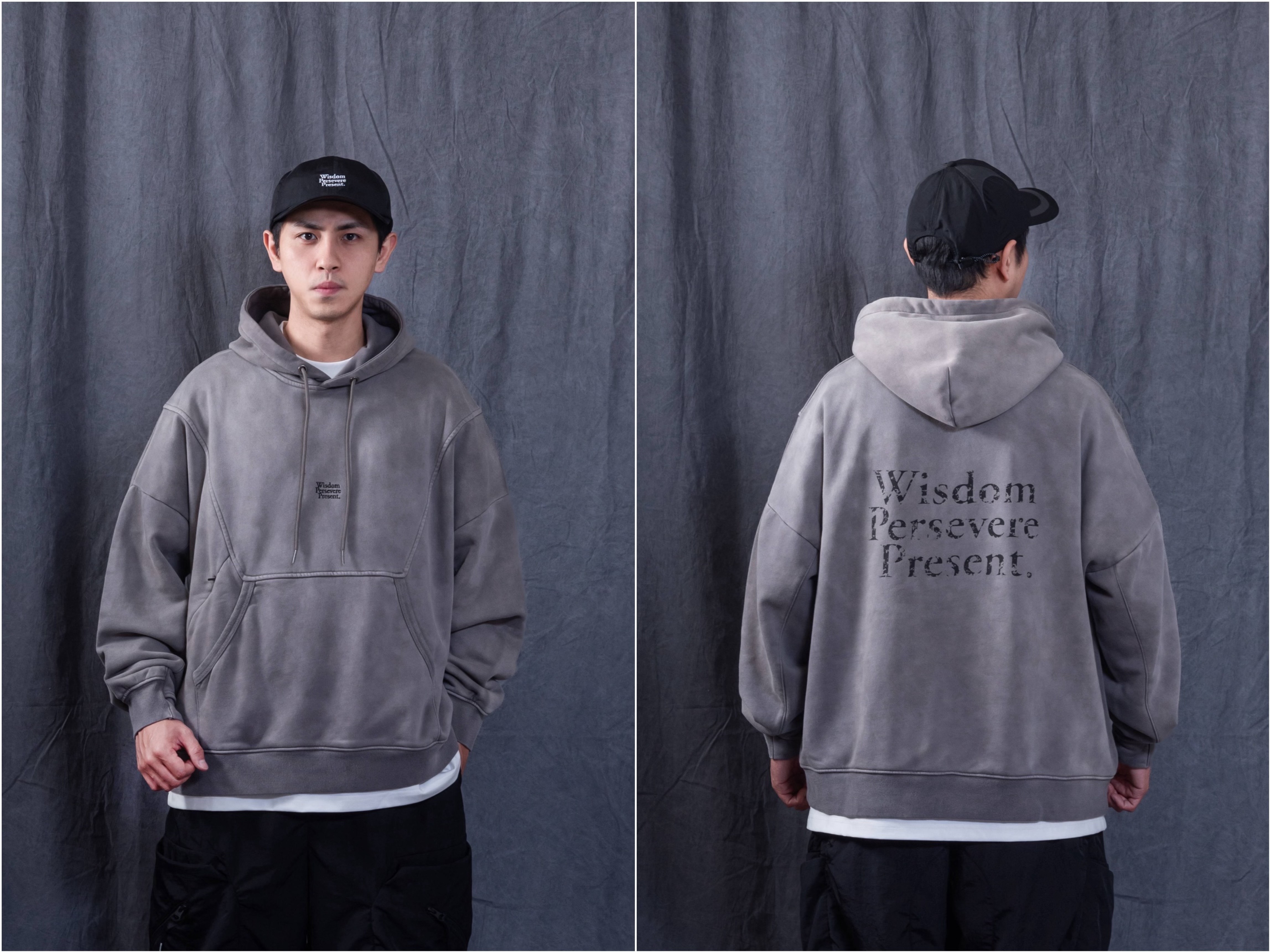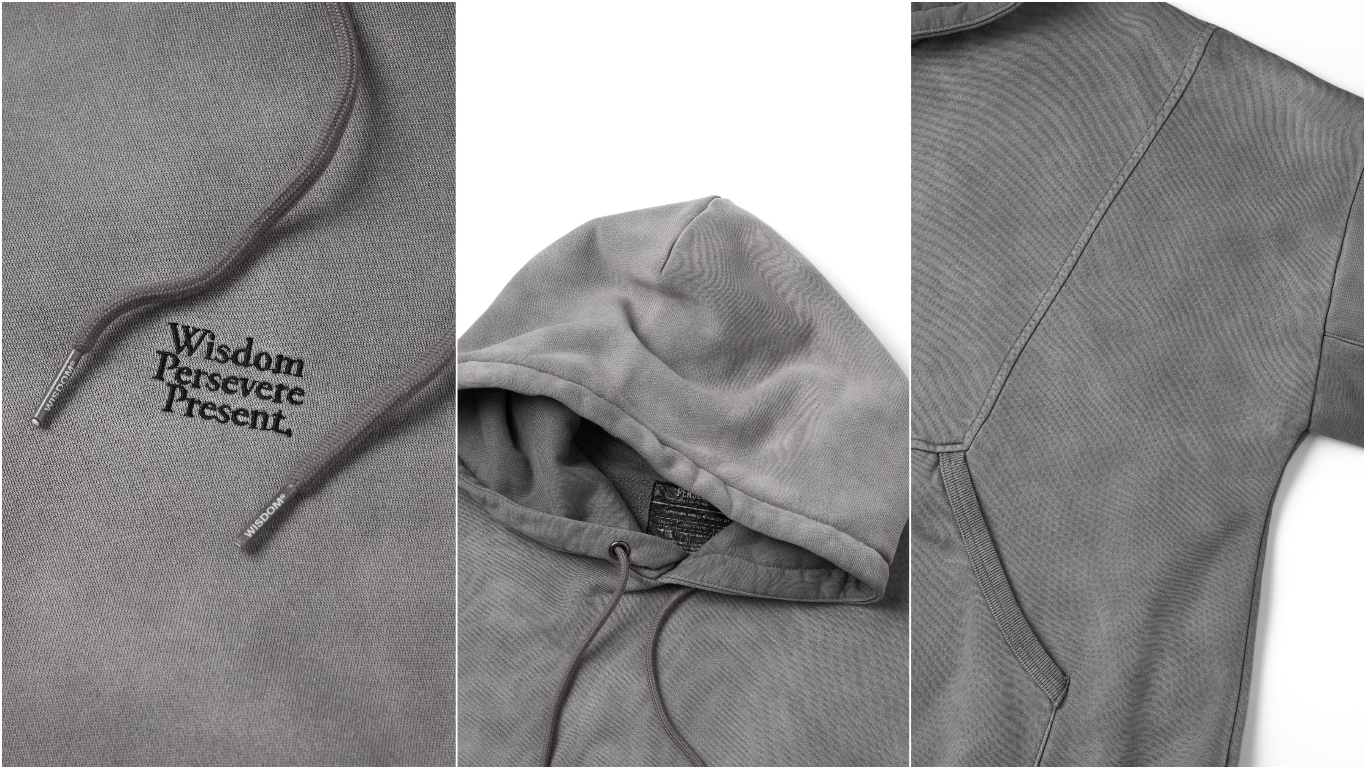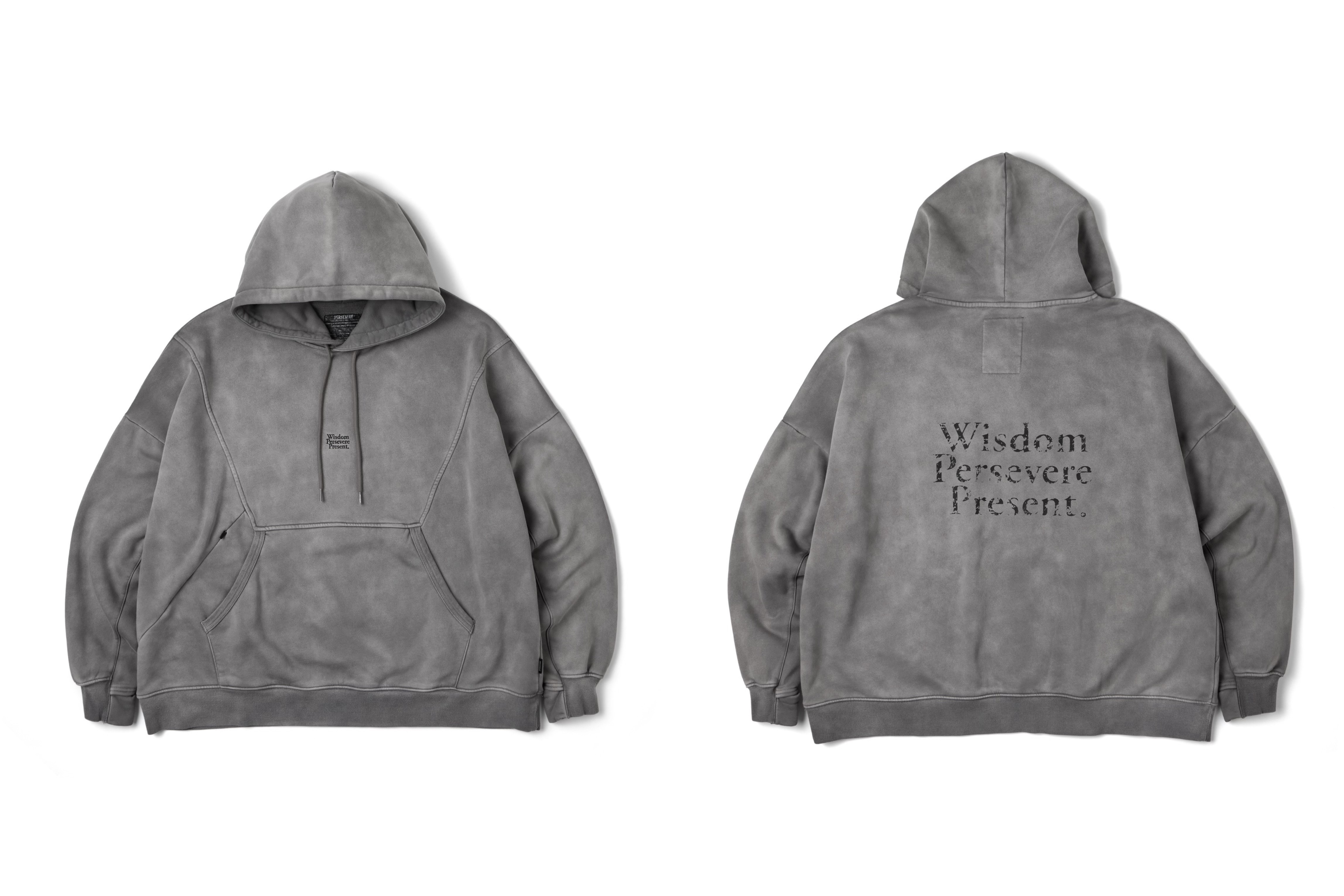 以“ LOOMED ECHOES ” 的概念形塑,WISDOM® 與PERSEVERE 攜手合作STYLE 01 品牌圖像連帽T恤,選用舒適帶有自然挺度的科技紅外線刷毛面料製作,寬鬆落肩版型搭配幾何線條剪裁,並融入聯名視覺圖像,且特別運用Garment dyed 染製工藝在灰色款,讓灰色款呈現多層水洗效果。