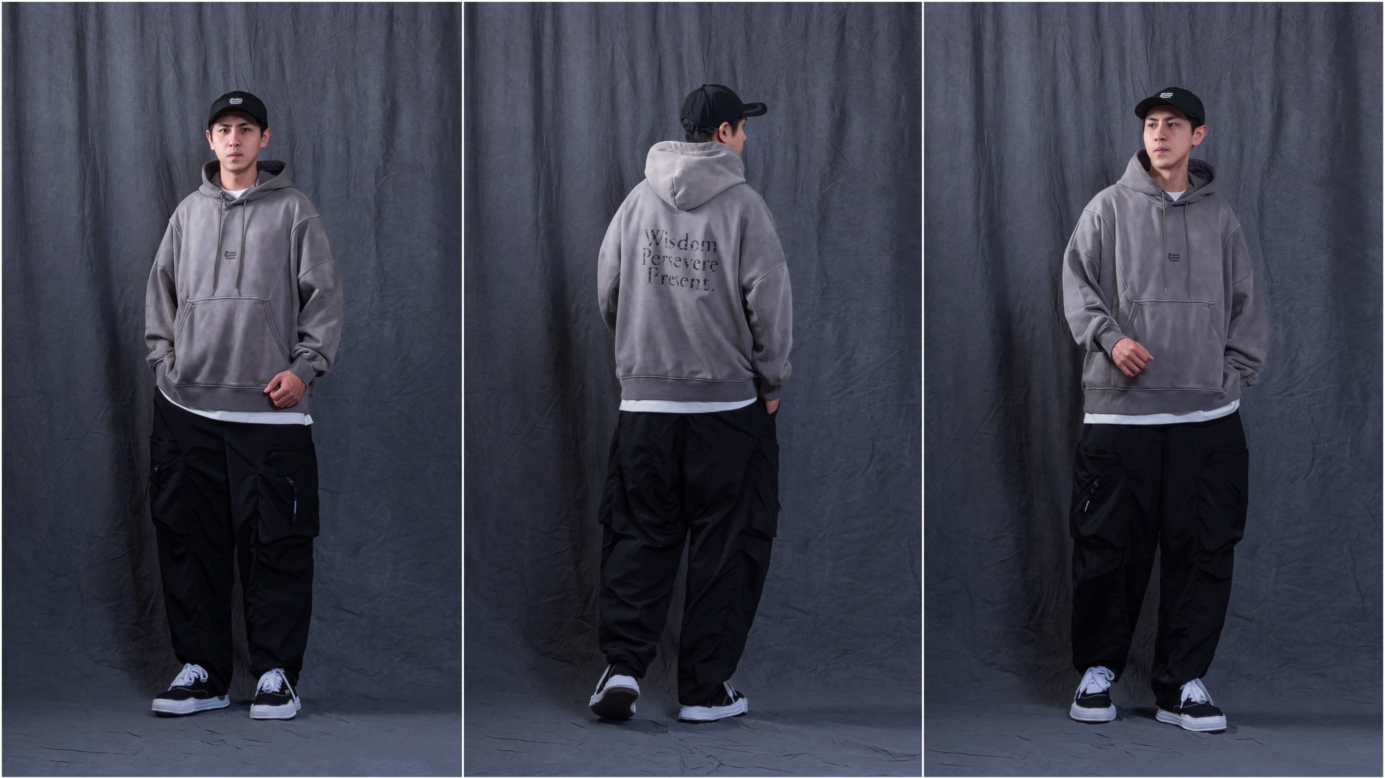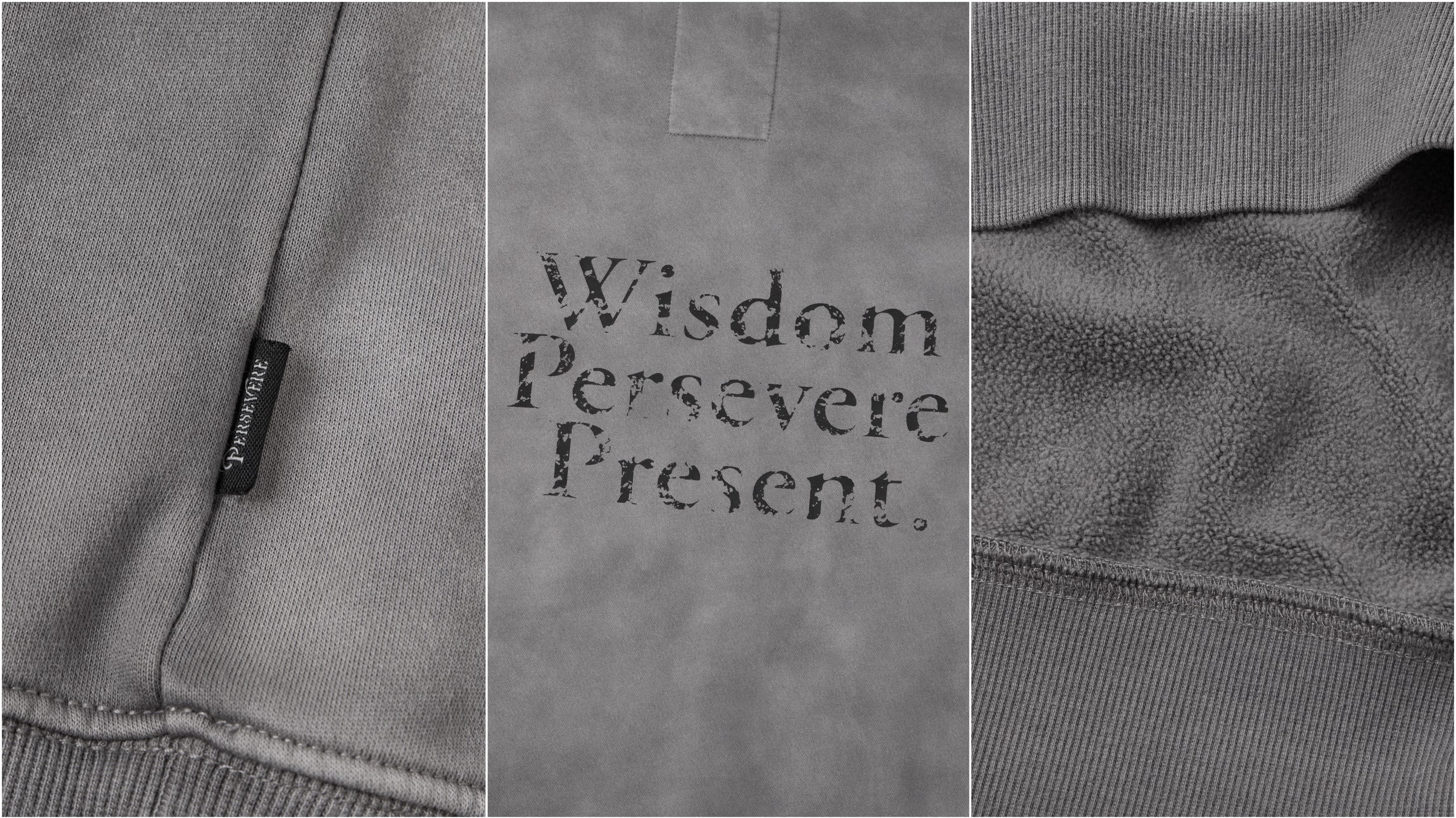 WISDOM® 與PERSEVERE 攜手合作,整體形象透過“ LOOMED ECHOES ” 的概念形塑,在經歷時間淬鍊的迴響下,呈現出帶有使用感的斑駁色落質地與極簡黑白灰設計。