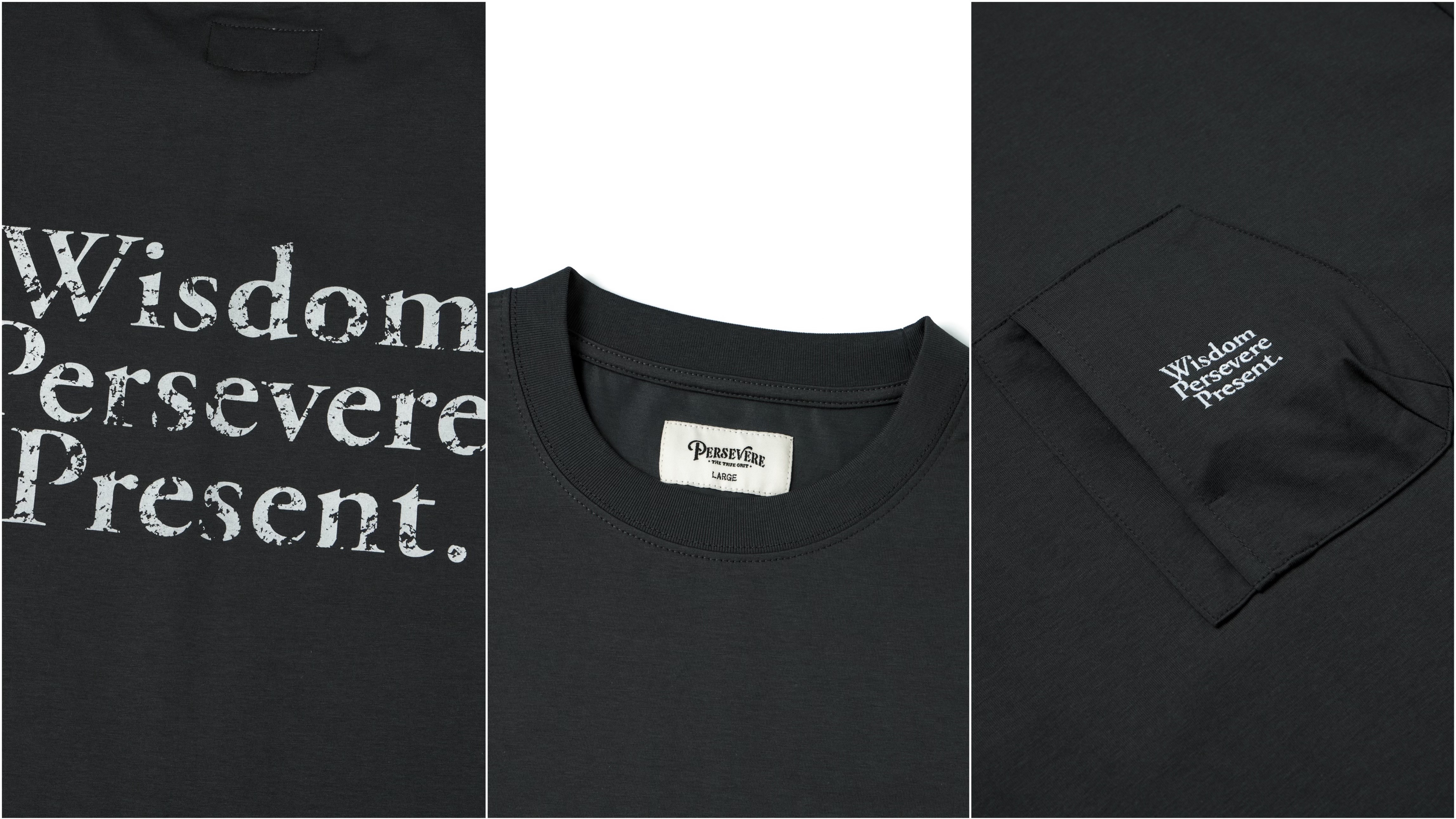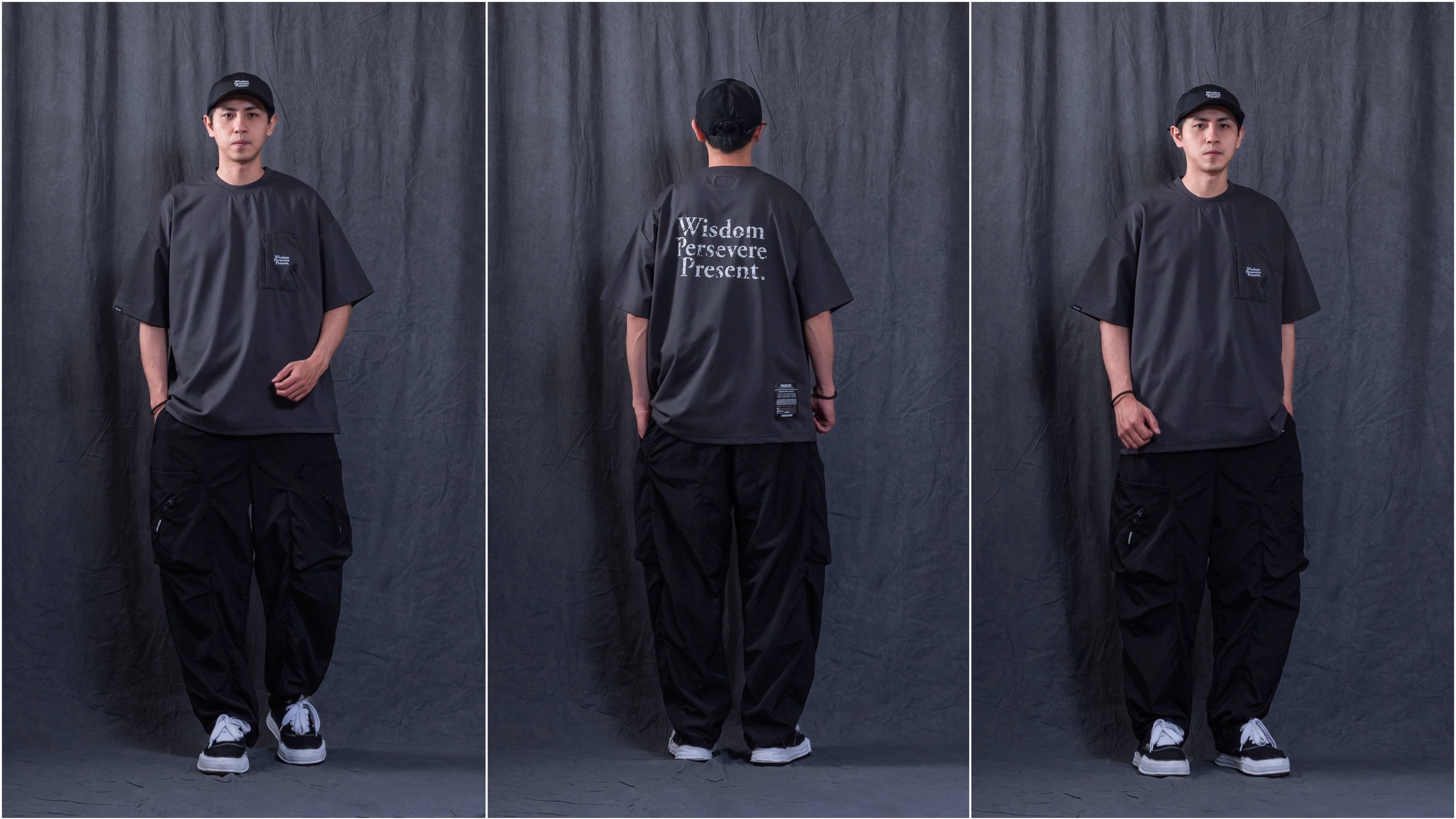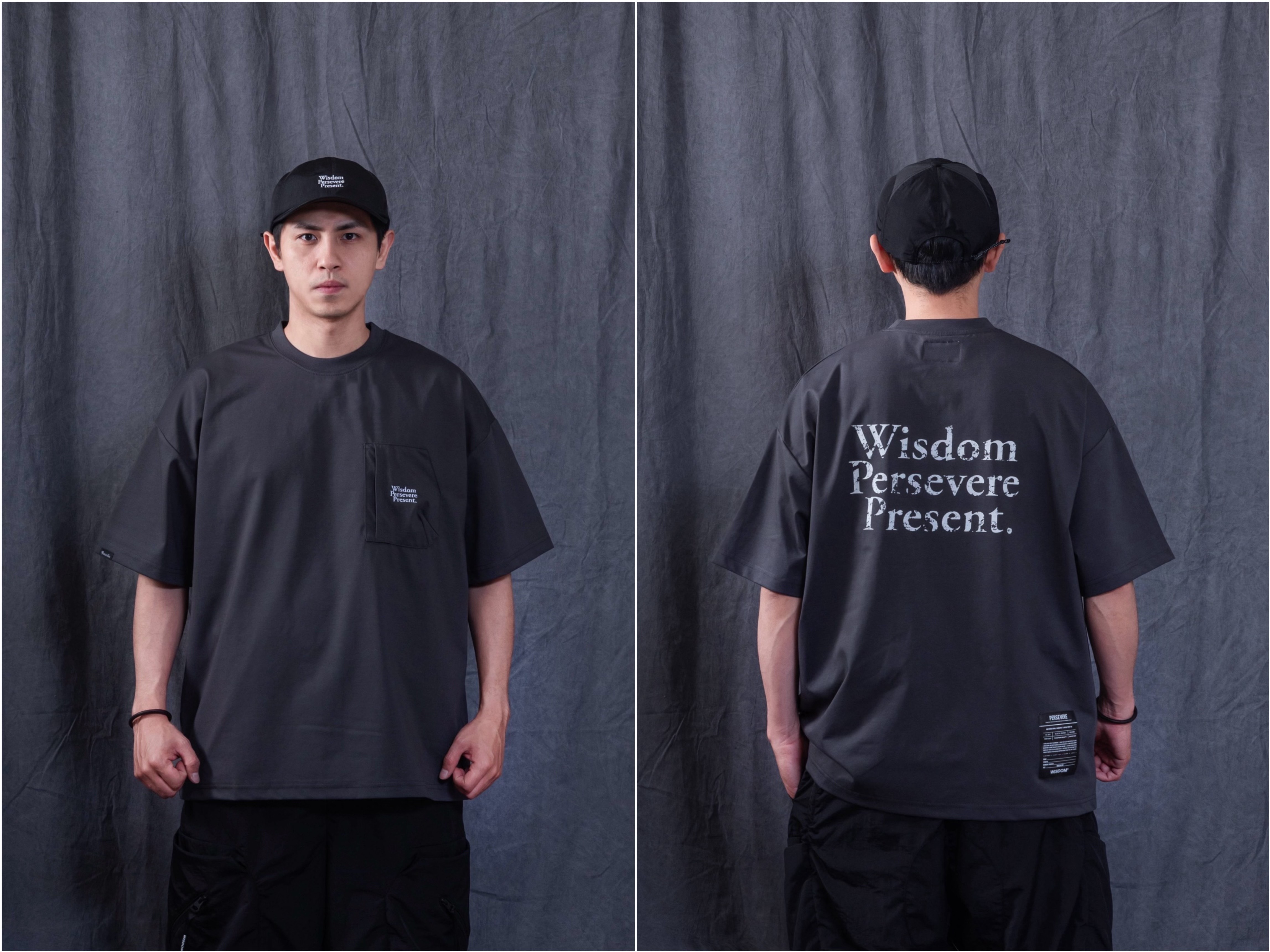 以“ LOOMED ECHOES ” 的概念形塑,WISDOM® 與PERSEVERE 攜手合作STYLE 02 品牌圖像短袖T恤,以高磅數防潑水面料製作,寬鬆的版型輪廓,搭配胸前3D立體口袋細節,並以二種工法呈現聯名視覺圖像。